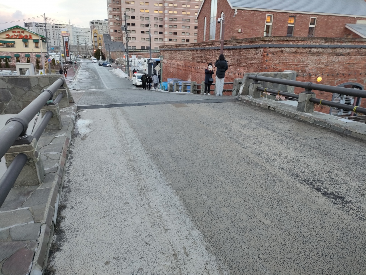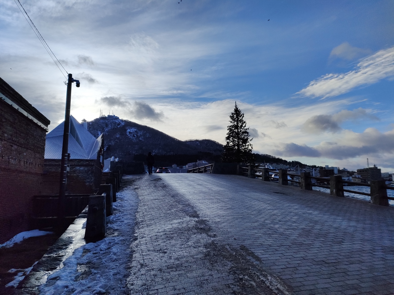 函館ベイエリアのメインストリートに架かる橋で、太鼓橋とまではいきませんが、急に盛り上がっていて、橋上からの函館山と金森赤レンガ倉庫の眺めが絵になる感じで良いです。