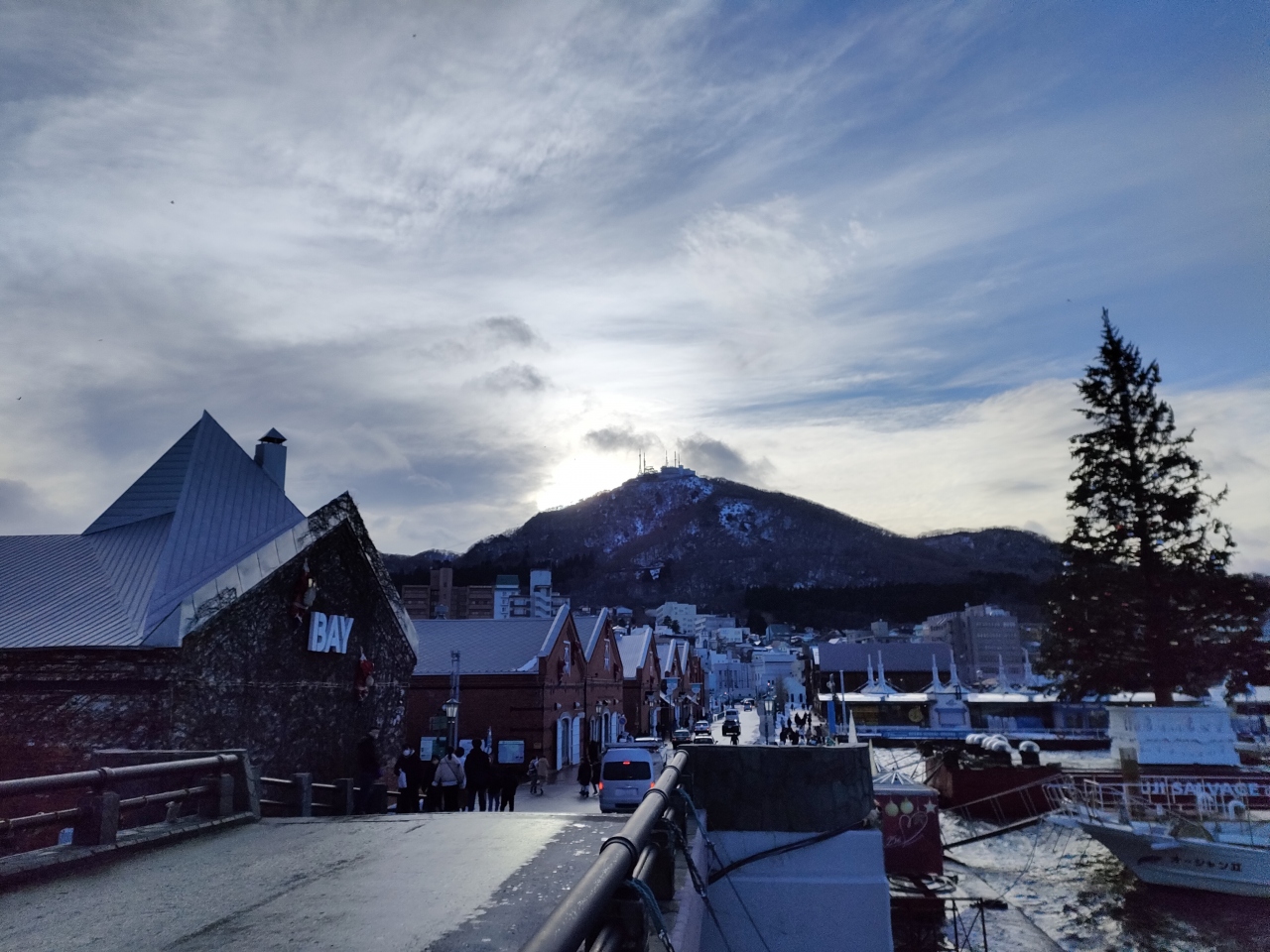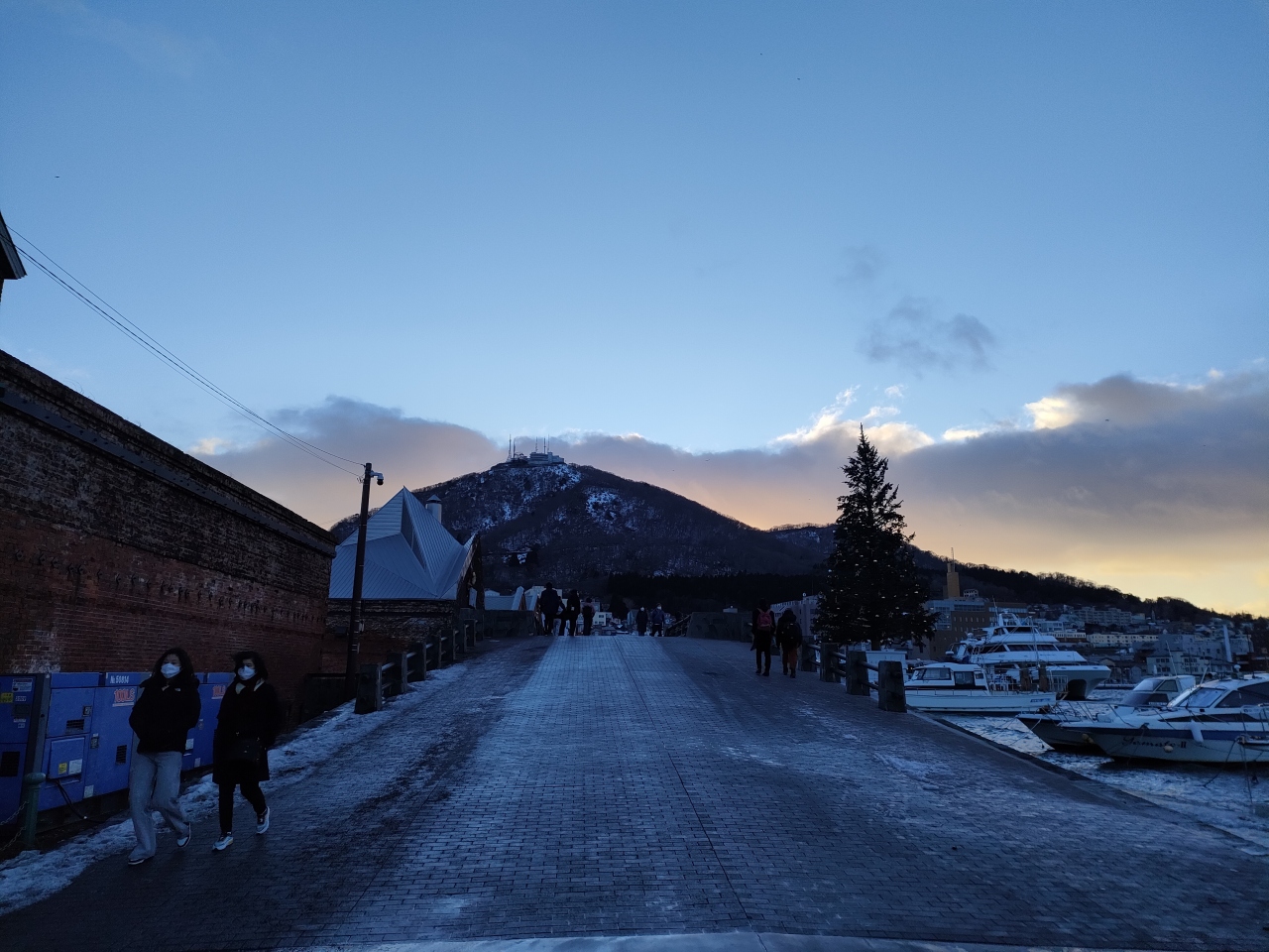 - 橋からの函館山と金森赤レンガ倉庫の眺めが良い