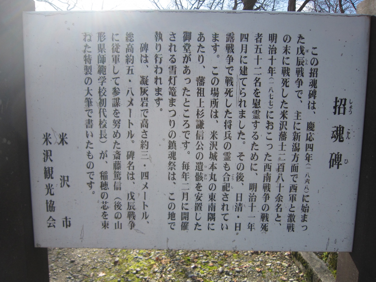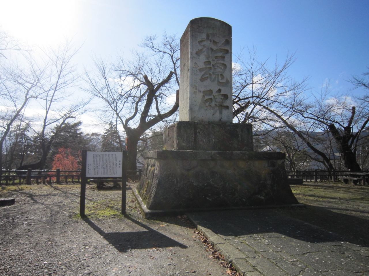 舞鶴橋を渡り本丸跡に入って左手、史跡上杉謙信公祠堂跡の標柱があり、丸石を組合せた石段を登って行きます。高台になった広場があり、柵に囲まれた祠堂跡碑と招魂碑がありました。祠堂跡碑の先に天高く招魂碑が建っていました。戊辰・西南戦争で戦死した将兵を慰霊するために建立、その後、日清・日露戦争の戦死者も合祀されているそうです。