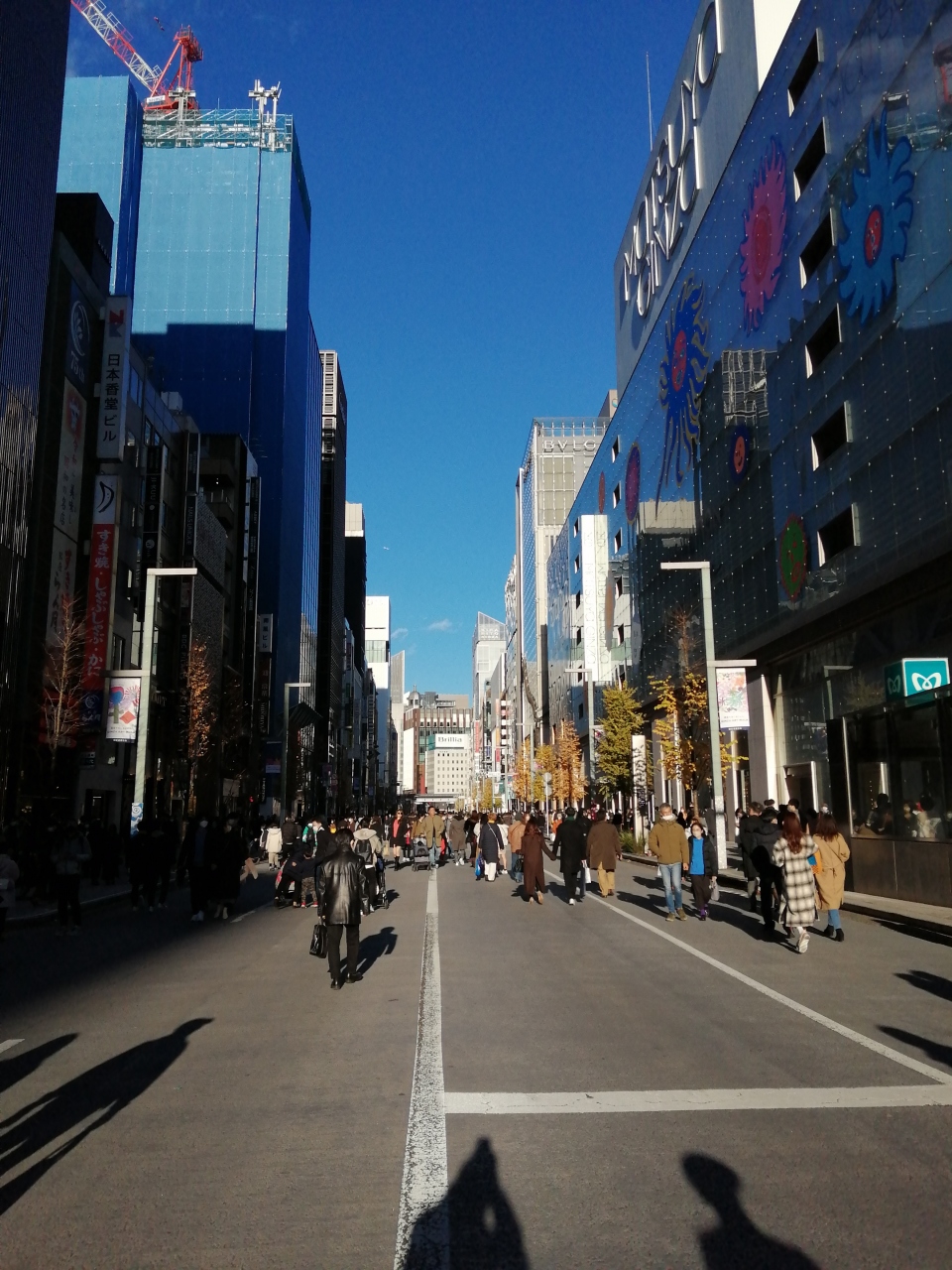銀座一丁目から新橋の手前の九丁目まで、長ーくのびた大通りです。土日は昼間歩行者天国になるので、とてもゆっくり歩けます。スマホで写真をとったり、SNS用の動画を撮る人もいたりして、かなり賑わいを見せます。三越、松屋、シックスなど百貨店も並んでいます。