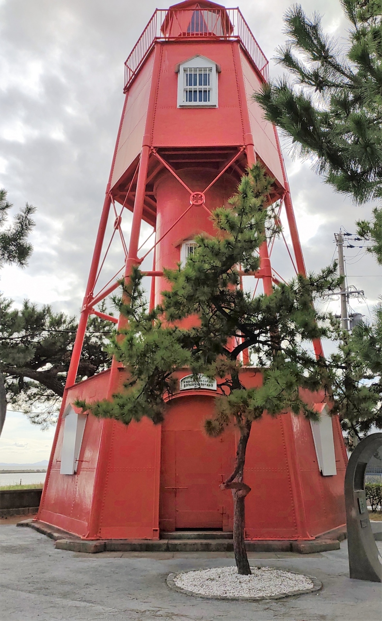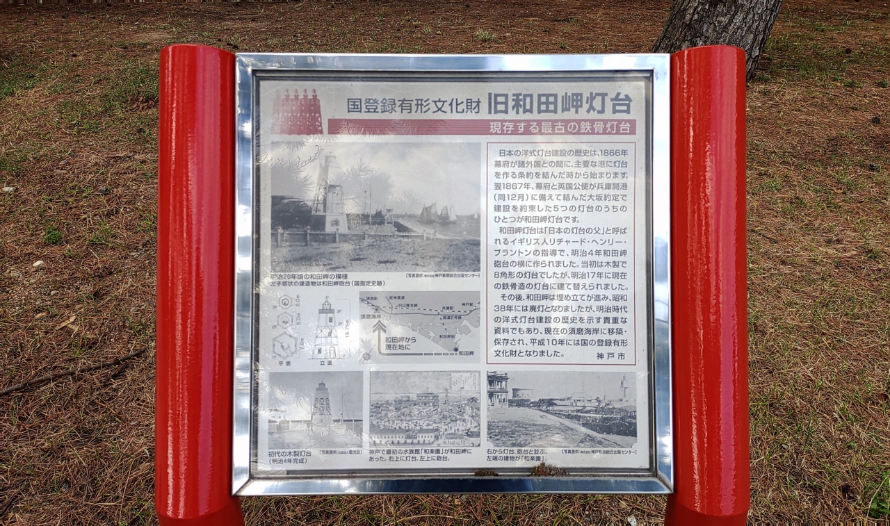 須磨水族館から須磨駅方面に戻る際に須磨海浜公園内を散策していて見かけました。海浜公園の中ほどになります。全高16mほどとこぶりですが、真っ赤な塔で、松林の中でも結構目立ちます。説明文によると、元は名前の通り和田岬に設置されてものを移転。数ある灯台のなかでも鉄骨造りの灯台としては日本最古だそうです。