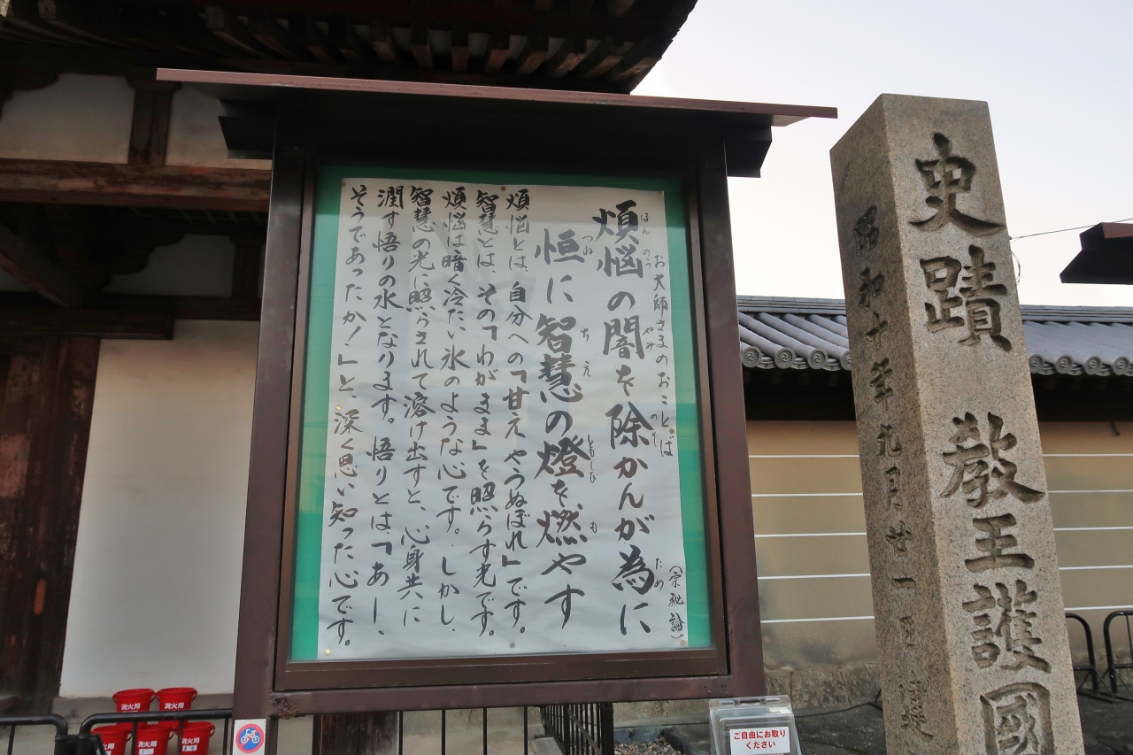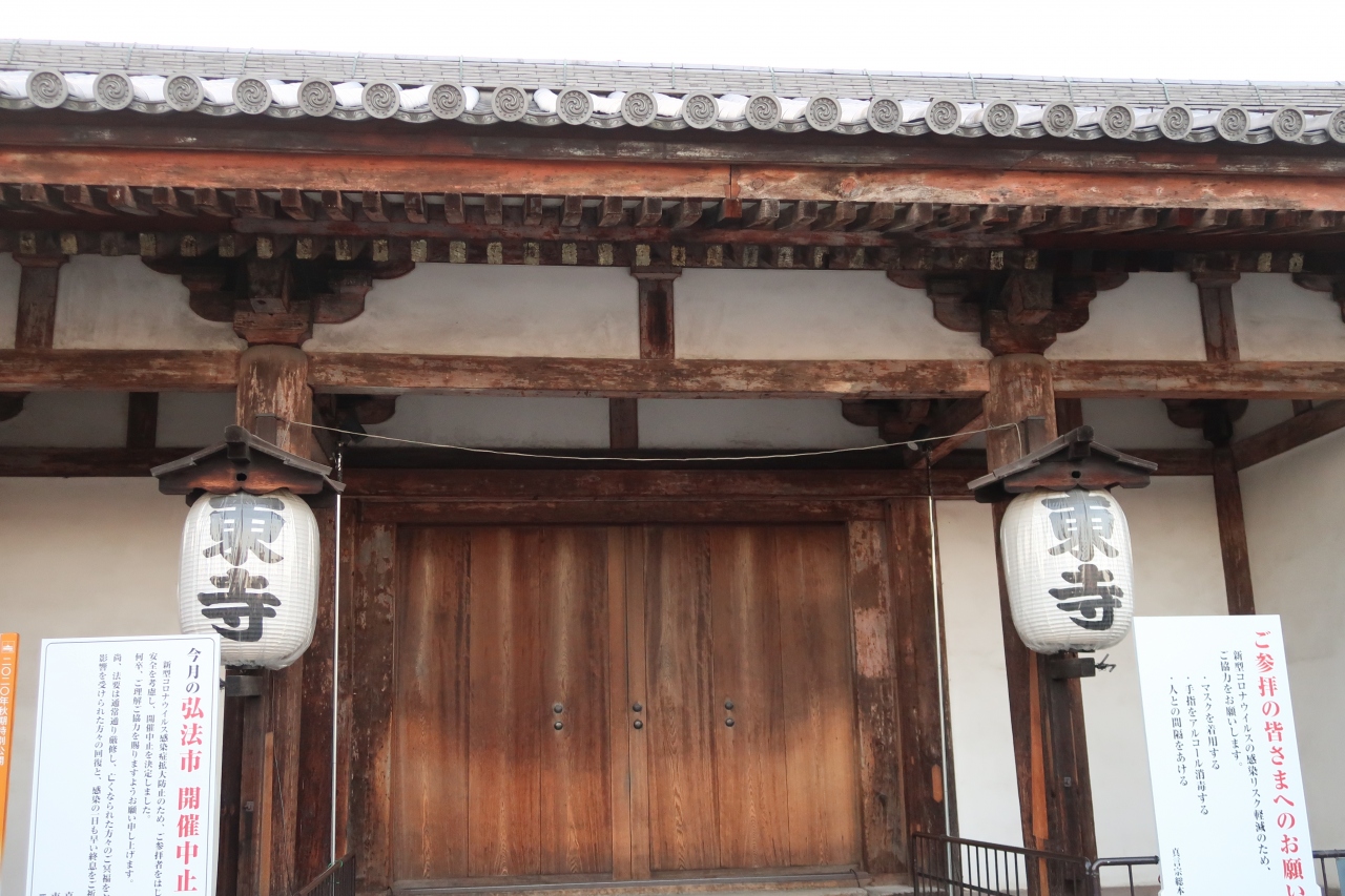 鎌倉時代に造られた東寺の門の一つで、大宮通りに面しています。正門の南大門の方から入場しましたが、思っていたよりもずっと広大な境内を散策している内に、閉門になってしまいました。午後5時過ぎまで開いているのは、この慶賀門のみで、現在は東寺のメインゲートになっているようです。大師堂から食堂の前を通り、駐車場を早歩きして横切り、何とか外に出ることができました。門前に掲げてあった「お大師さまのおことば」を読んで、東寺を後にしました。
