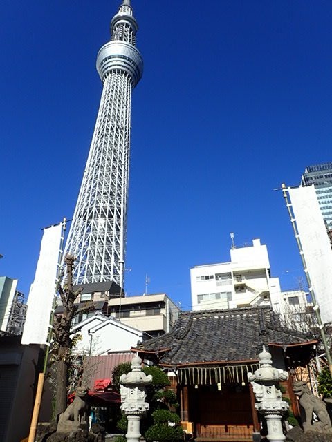 地下鉄や東武線が乗り入れている押上駅から歩いてすぐです。東京スカイツリーが近いですが、観光客はほとんどいなくて静かでした。この日は天気がよくてスカイツリーと青空がきれいだったので、神社も入れて写真をとってみました。