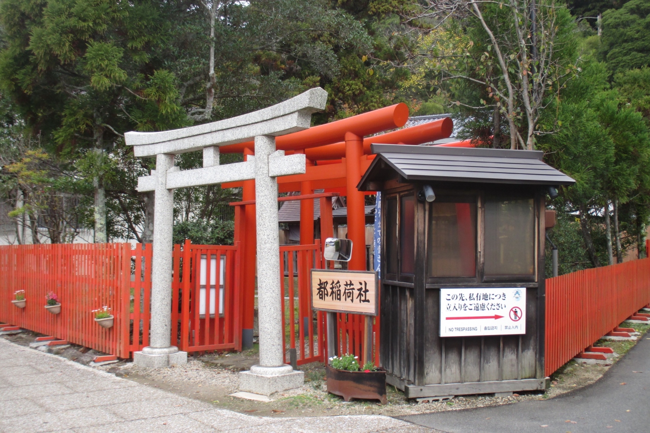 出雲大社教祖霊社の境内の北辺に沿った路地を入ったところに、小振りな都稲荷社がありました。江戸時代末期に、第76代千家俊秀国造の弟さんの千家俊信が、京都伏見稲荷大社を勧請したとのことです。従って、ご祭神は稲荷大神(宇迦之御霊神、佐田彦神、大宮能売神、田中神、四神)の5柱でした。拝殿と本殿との間の幣殿部分は屋根だけの渡り廊下の様になっていました。