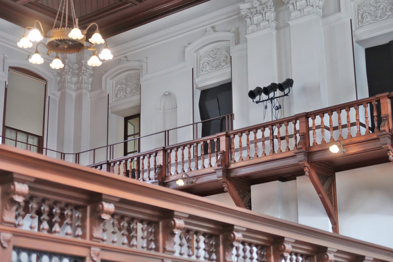 三条通りにある、旧日本銀行京都支店だったという赤レンガ造りの洋館です。今は博物館になっているおかげで、かつての営業室を見学することができました。客溜まりエリアと営業室を仕切っている柱もカウンターも、床から天井まで、木がふんだんに使われていました。シャンデリアが下がっている部分の天井は、天窓になっていました。