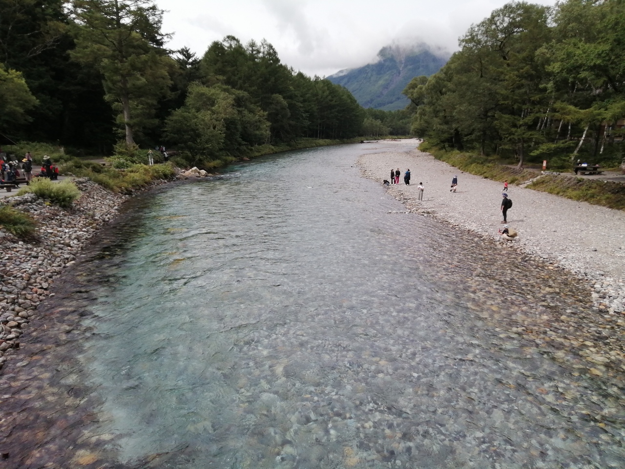 上高地に来たはいいけれど、天気が悪い…。曇っていたって梓川が清流なのは変わりなく、実際水はめっちゃきれいなんですが、なにせ映えない…。上高地に行ってこれは致命的です。天気のことなので誰にも文句は言えませんが…。
