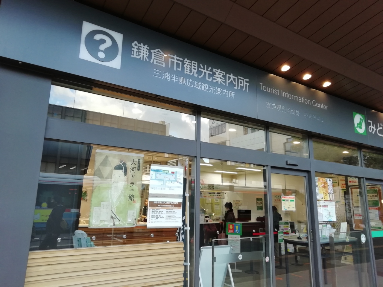 鎌倉駅東口を出て、すぐ左側にあります。ガラス張りで、隣がみどりの窓口になっています。パンフレットや地図が置いてあり、自由に手にとることができます。スタッフさんは、外国語でも対応できます。相談には丁寧に応じて頂けますが、土日は混雑するようです。