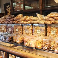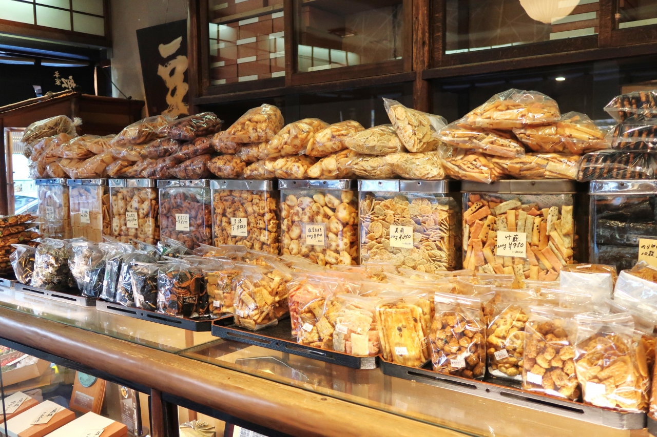 1905年以来、三条大橋の西側に残る町家で営業を続けている老舗京菓子店です。看板商品は五色豆ですが、あられやおかき、こんぺいとう、カラフルな手毬飴まで、京都の日常のおやつが、選ぶのが大変なほど多種類揃っていました。旅先での夜のおつまみにぴったりの「旅の友・170円」や、海苔おかきなどを購入しました。