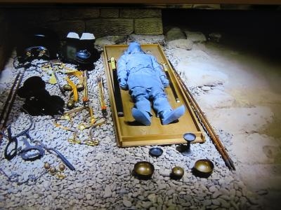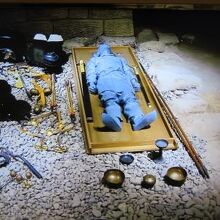 将軍山古墳は平成の初めの頃まで一般の方の所有地だったようです。墳丘を削って民家が建てられていたところを買い取ったようで1991年から復原事業を始め6年の歳月をかけ、将軍山古墳を復原したそうです、館内には馬胄や蛇行状鉄器などが展示されていました。