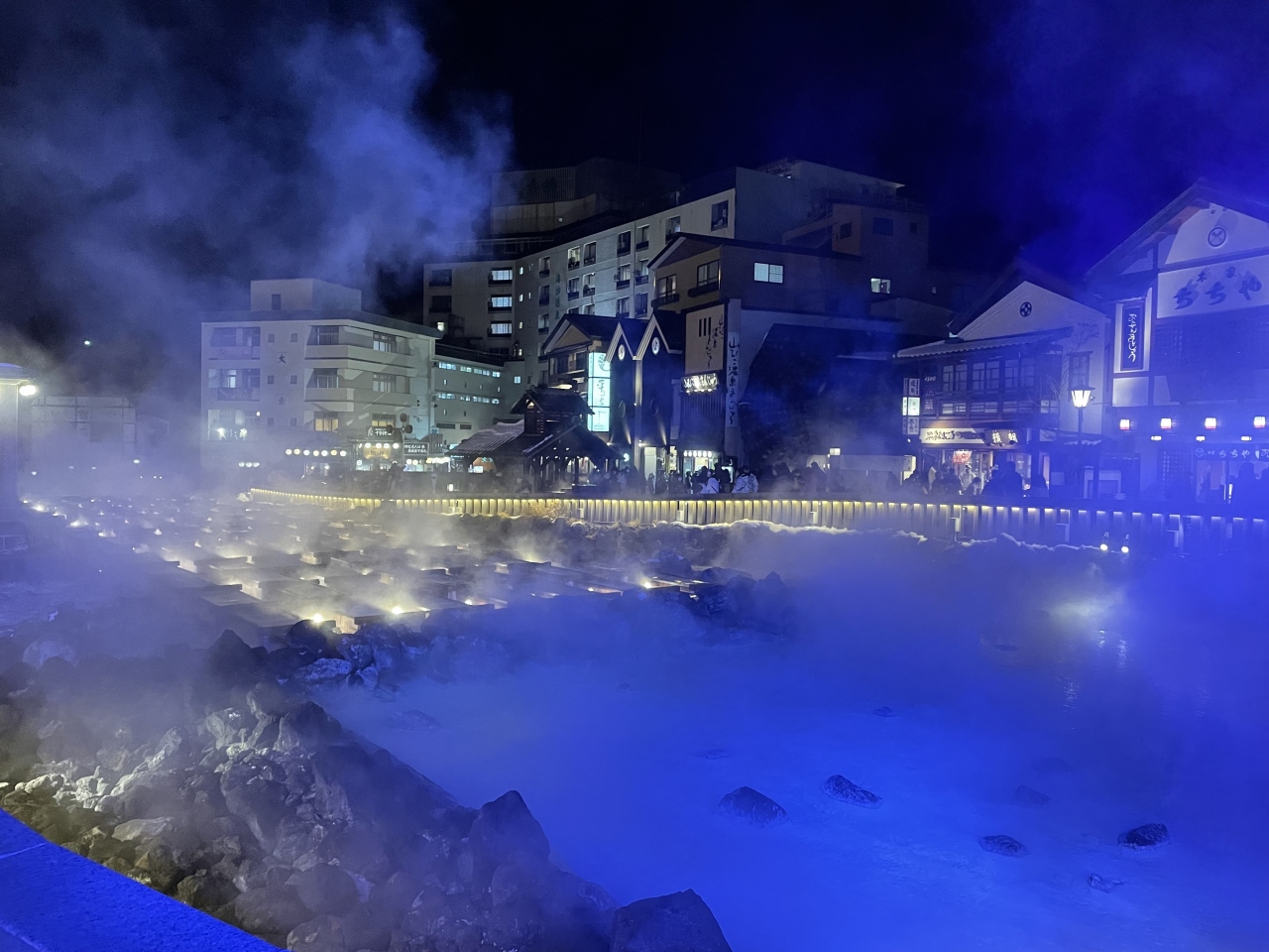 湯畑で行われるイルミネーション。夜でも湯気がたちのぼっているので、イルミネーションの光と合わさって非常に幻想的です。それほど広くはなく、すぐに見終わりますが、付近には夜でも営業している店も多くあります。