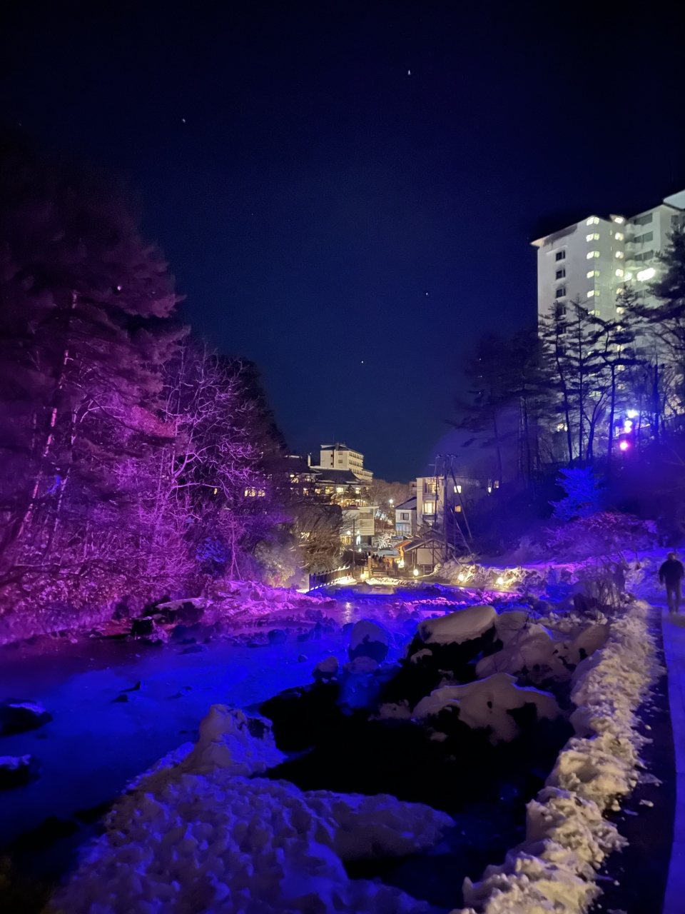 湯畑から徒歩10分。かなり広いです。入り口には土産物屋さんがあります。公衆トイレもあり、一番奥には広い露天風呂がある立ち寄り湯もあります。途中には小さな神社もあります。夜にはイルミネーションも行われており、雰囲気が良いです。