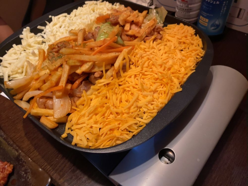 枝豆、サラダ、チキン&フラドポテト、チーズタッカルビ食べ放題、〆のポックンパ、デザート、飲み放題が付いて3000円(税込み)ですので、かなりお得です。ただし、休み前は+500円です。
