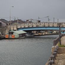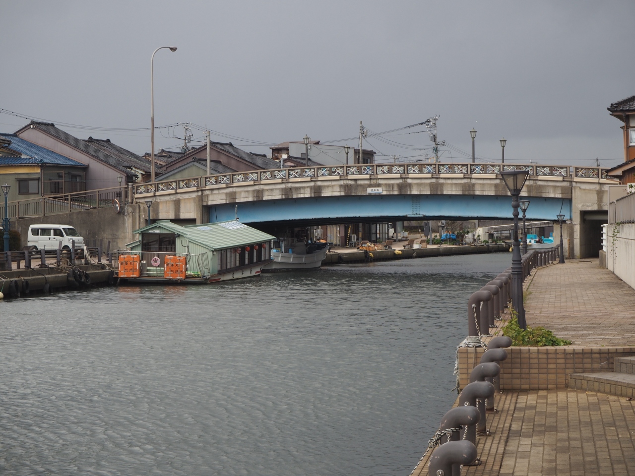 神楽橋は新湊の市街地を東西に走る内川に架かる橋です。内川のちょうど中ほどで川の駅の新湊のすぐの場所です。橋の欄干には郷土出身の工芸作家の大伴氏の製作による72枚のステンドグラスがはめ込まれています。朝日や夕日に照らされると美しく輝き、幻想的な雰囲気を醸すようです。別名虹の懸け橋と呼ばれています。