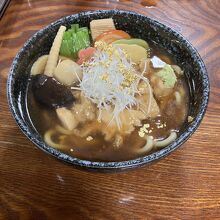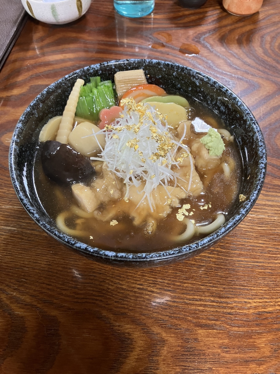 金沢城の石川門の近くにたくさん茶店が並んでます。一月なので温かいものが食べたくて入りました。治部煮うどんを注文してけっこう待ちましたが、充実した内容でした。鶏肉もたっぷり、金沢らしく3色の麩やかまぼこも入って彩りもきれい、十分お腹いっぱいになりました。