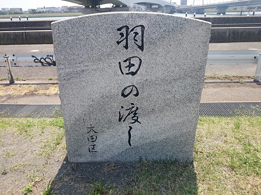 京浜急行空港線大鳥居駅から徒歩15分程度、大田区羽田2丁目の大師橋近くに石碑が立っています。川崎大師参拝の人たちが利用した羽田の渡しのあった場所です。昭和14年(1939年)に大師橋が出来るまで続いていたそうです。観光用に羽田の渡しの復活の計画は無いのでしょうか?