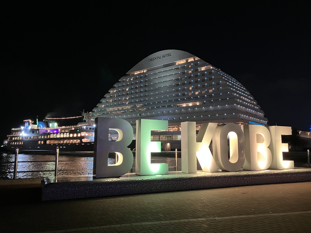 神戸のベイエリアにあるメリケンパーク内にあるモニュメントで記念写真スポットになっています。近くには、モアイ像を思わせるような神戸海援隊の碑などもあります。暗くなった夜の時間にやって来たので、ライトアップされた姿もキレイでした。