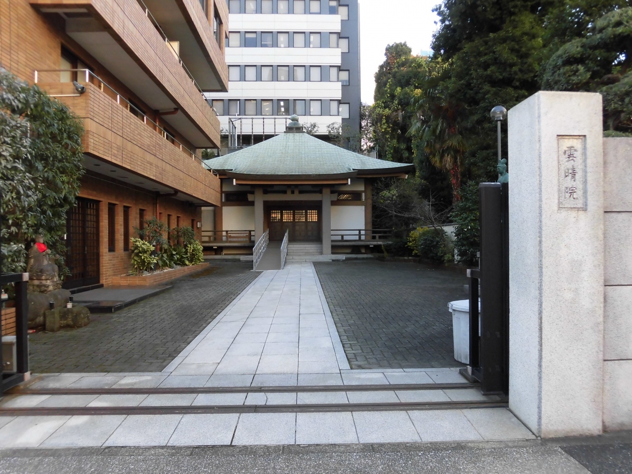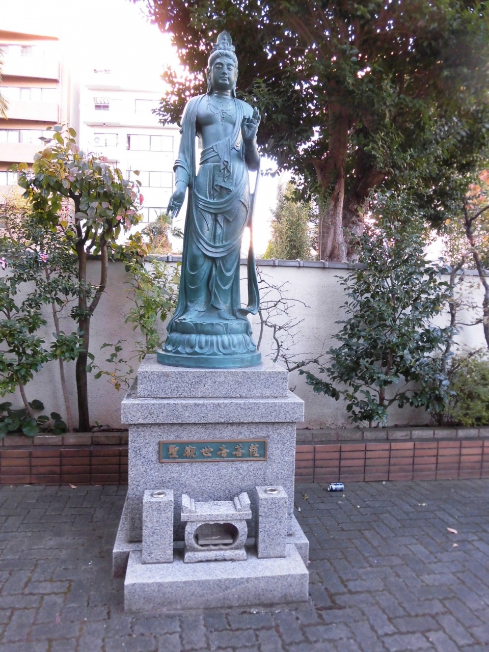 地下鉄御成門から芝公園3丁目近辺を散策しているときに立ち寄った寺院です。本堂などは、確かに雰囲気はお寺の建物ですが、どちらかといえば、マンションのような建物に隣接したお寺のようにも見えました。境内には聖観世音菩薩像が祀られていて、やわらかなまなざしのお顔立ちがよかったです。