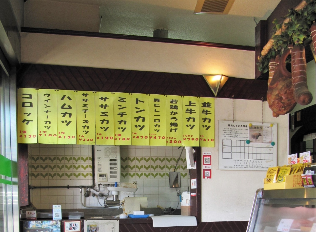 精肉店らしく黄色い紙にメニューと価格が記載され張り出されてる昔ながらのやり方に懐かしさを感じました。