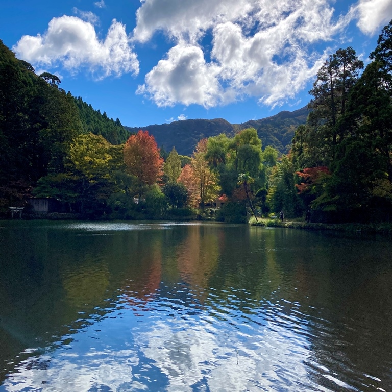 湯布院駅そばの駐車場に停めて歩いて行きました。思ったより時間がかかり、30分程歩きました。気候も天気も良かったので、いい散歩になりましたが、もっと金鱗湖近くにも駐車場があるので、そちらを選ぶ手もあると思います。スケール的には、湖というより池レベルですが、ちょうど紅葉のシーズンで、色づいた葉が水面に映り込み、美しかったです。