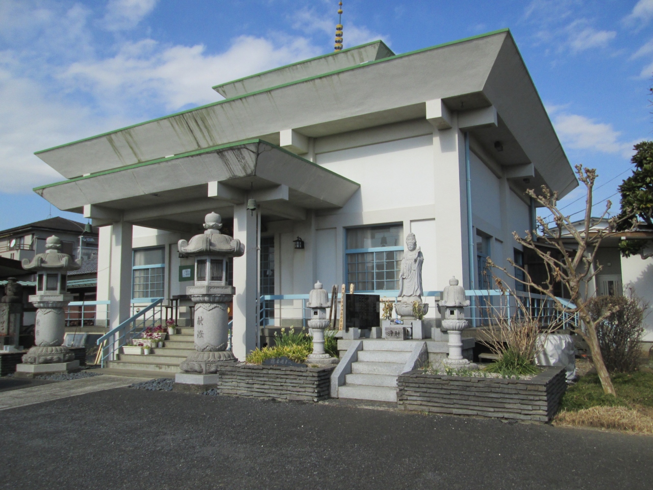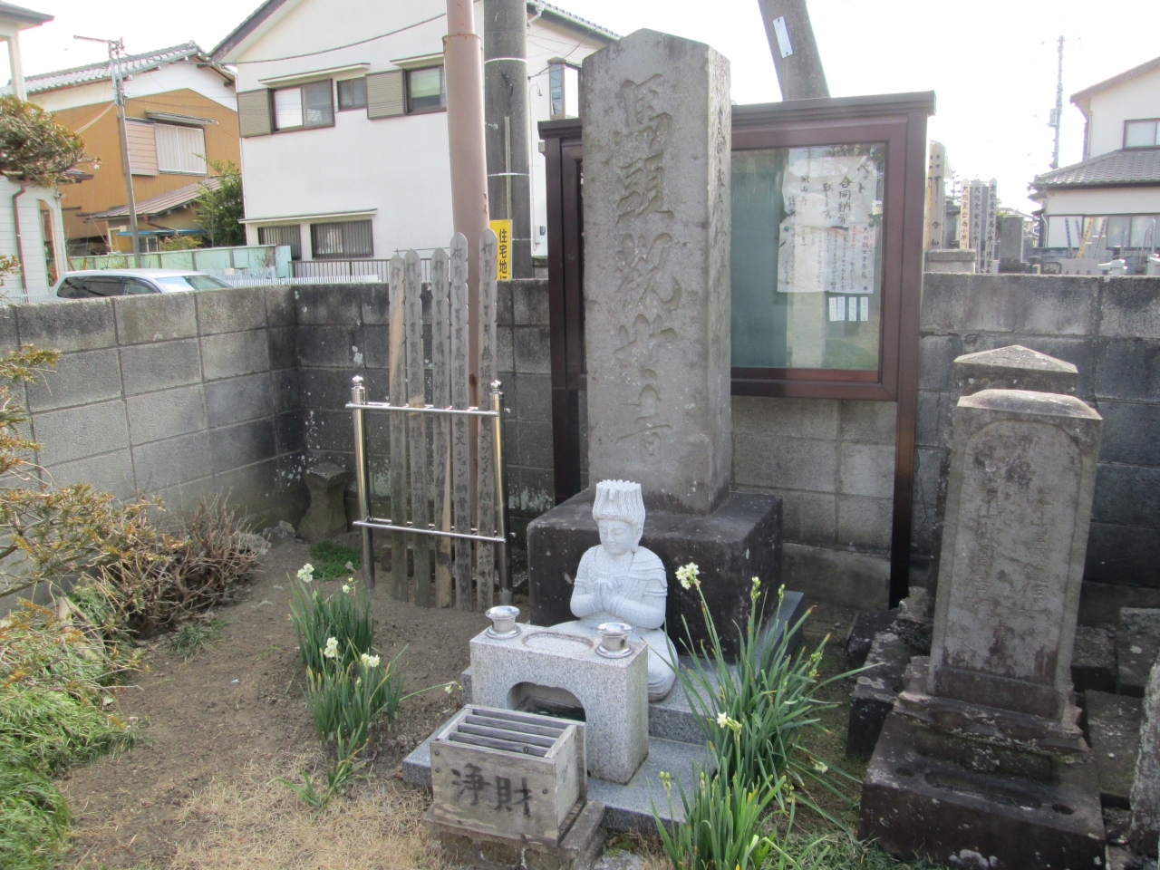 曹洞宗の一寺、創建は不詳、江戸時代初期、開山は桂屋瑞しゅう、本尊は薬師如来像です。山門を通ると、馬頭観世音菩薩、六地蔵、祠二社があります。左正面に鉄筋コンクリート製本堂、流山市七福神大黒天像、俳人栢日庵斗囿(一茶の弟子)の句碑、猿田彦大神像、祠二社等があります。新選組隊士の分宿した寺でもあります。境内にある馬頭観音像は新しいのに、石碑は古く歴史があるような碑です。アンバランスな感じがしました。また猿田彦大神像が祀られていましたが、庚申塔で時々見かけますが、神社系の庚申塔が多いように思えるのですが、寺院にあるのはなぜかわかりません
