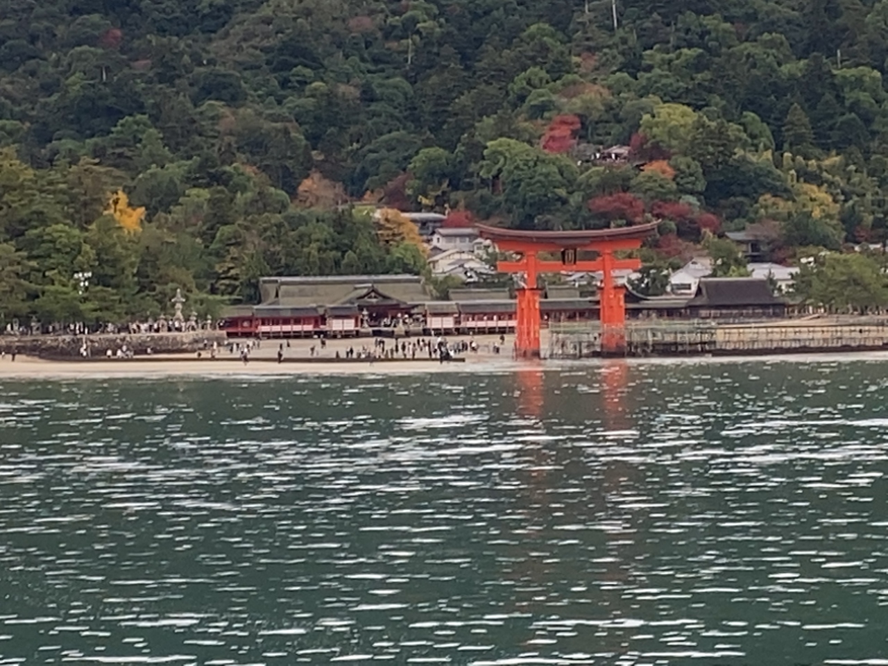フェリーの上からの景色もよく大鳥居の接近、帰りは遠くなる大鳥居の眺めもいつまでも見ていたい風景です。