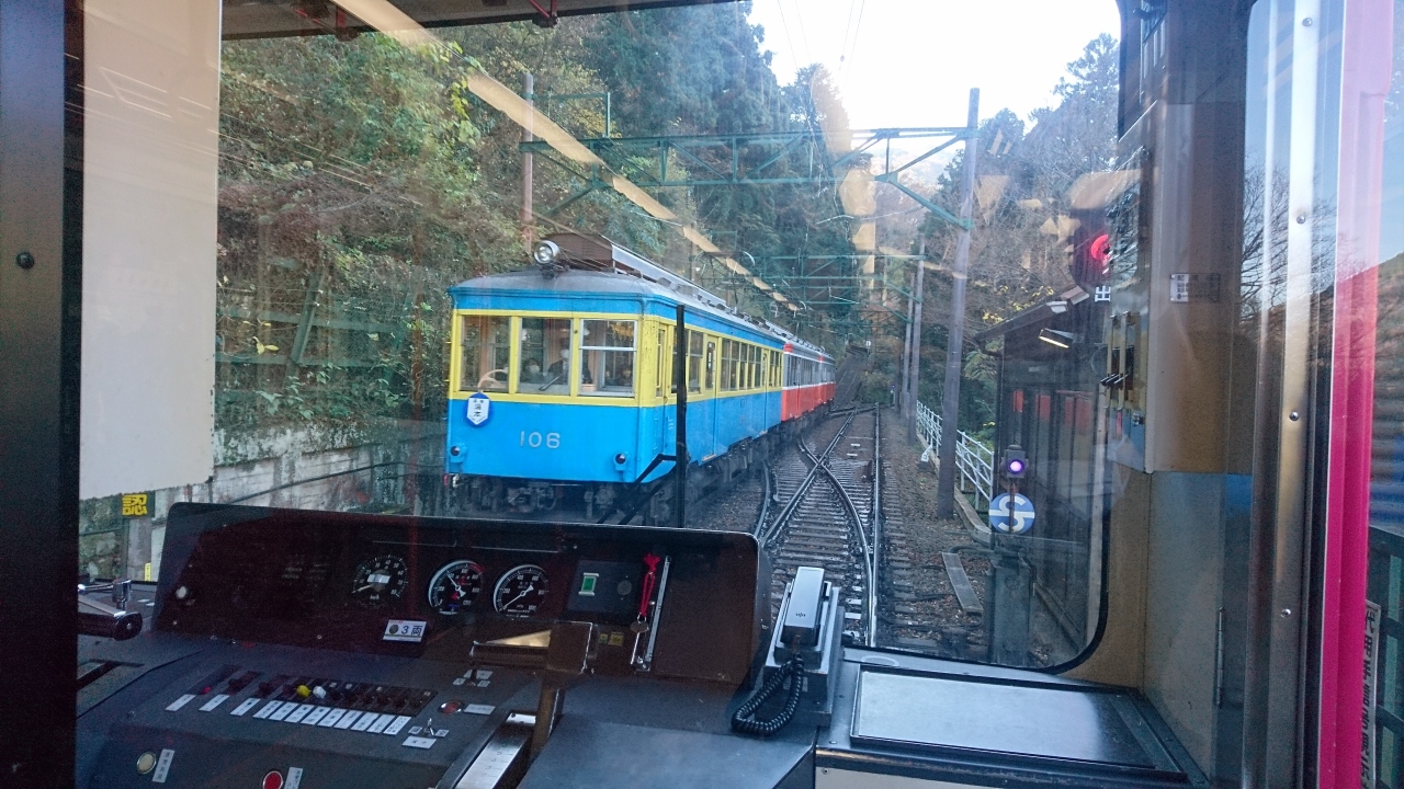 数十年ぶりに利用しました。この登山電車は何度もスイッチバックを繰り返して急こう配を登って行くので、移動手段に加えてアトラクションの乗り物のような楽しさがあります。スイッチバックの駅では、反対側からくる列車との交換が行われ、進行方向が変わります。この時、急こう配であることがよくわかります。