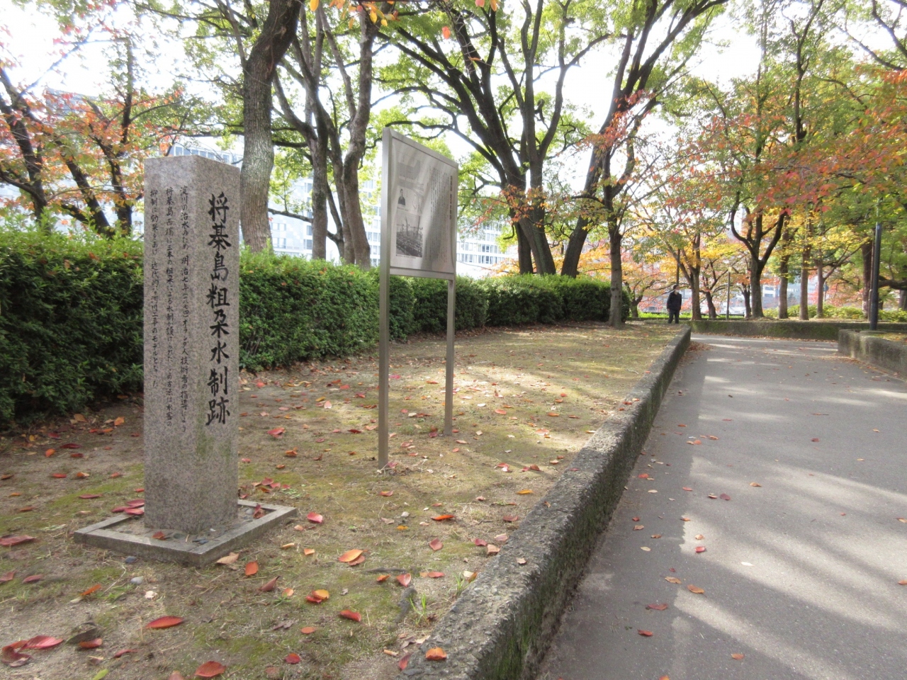 大阪市内を流れる「大川」の、天満橋と中之島公園の中間あたりの「南天満公園」に、「将基島(しょうぎじま)」と刻まれた小さな石碑が建っていました。