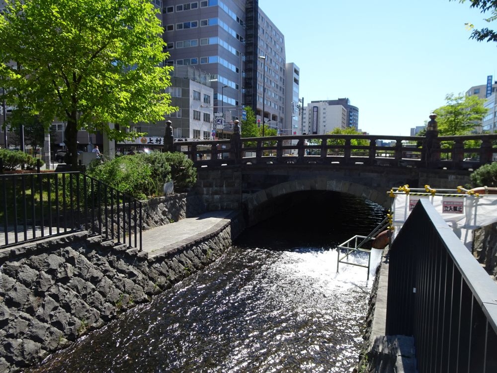 創成川に架かる石造りの橋です。橋のたもとに屋根付きのベンチがあって、休憩した際に「都会の中に石造りの橋というのは珍しいなぁ」と、まじまじと見ました。