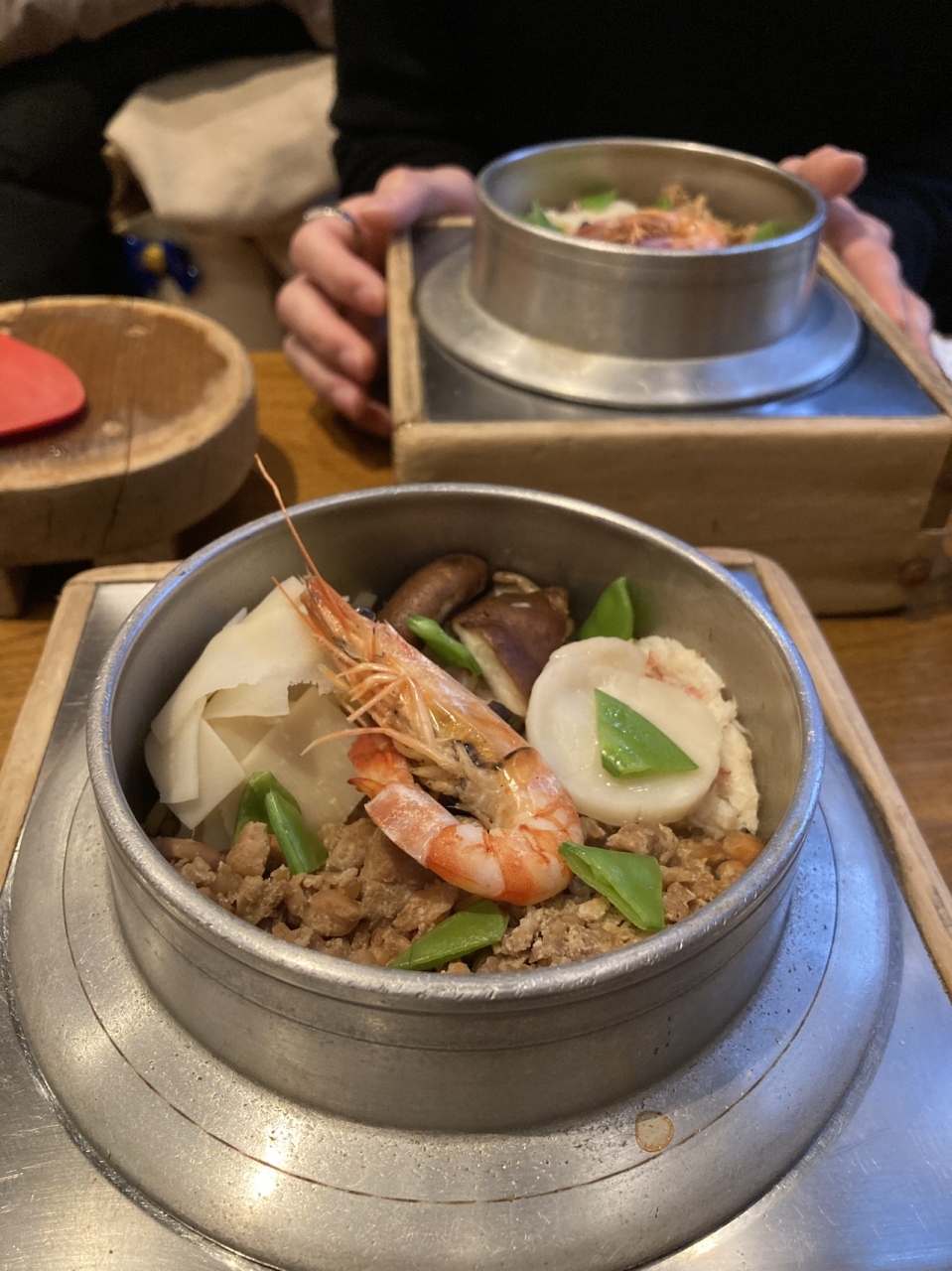 東京メトロ銀座線浅草駅から徒歩5分程度。仲見世通りの脇にある老舗釜めし屋さん。今回はランチコース利用。串焼きも3種付いており、釜めし、デザート、すべて大変美味しく大満足でした。(注意:釜めしは注文してから炊くので30分程度は待ちます)