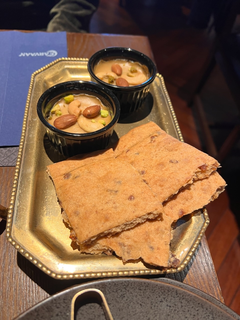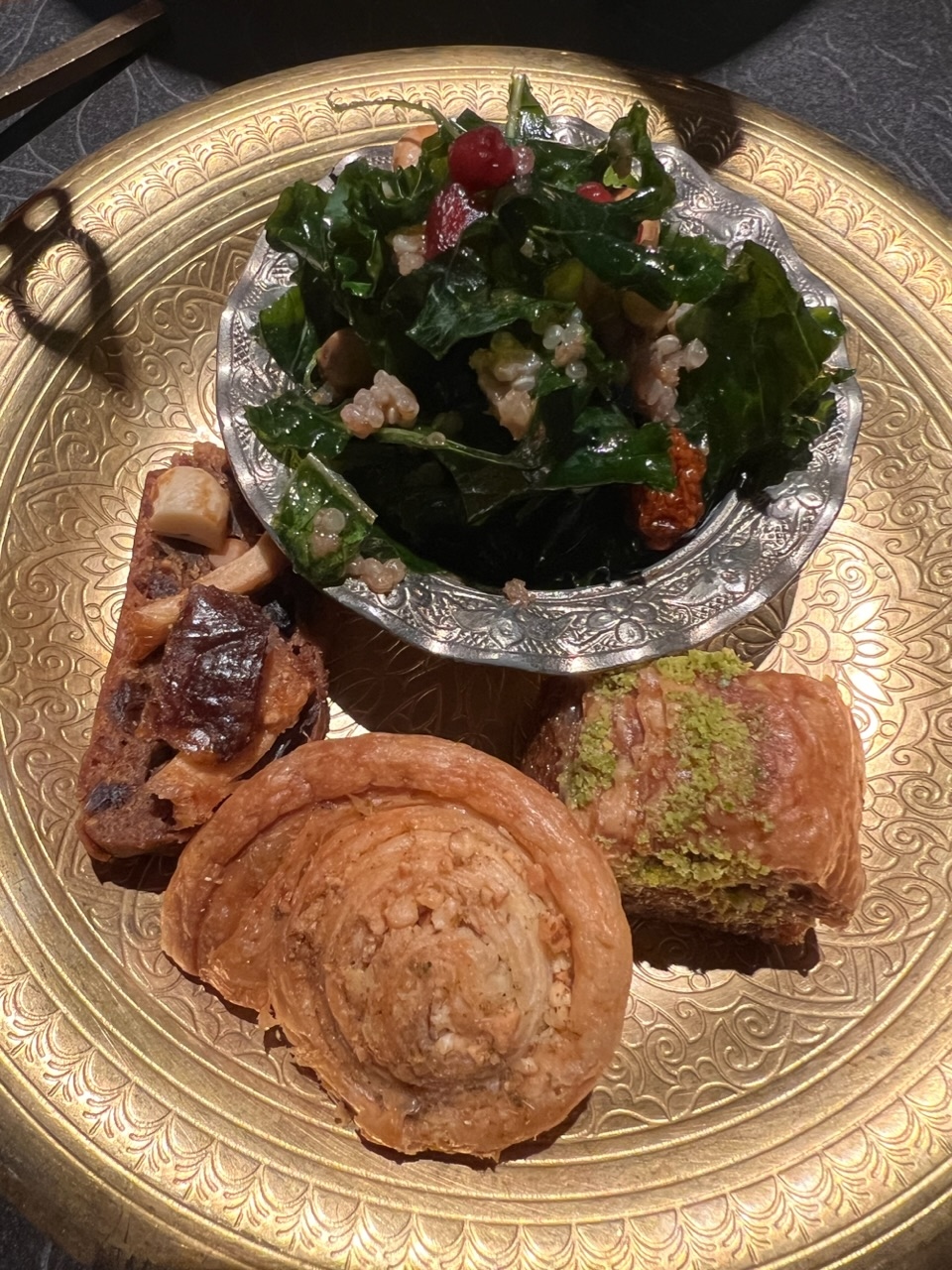 ドリンクが飲み放題で、メソポタミア文明のころからあるお菓子や、アラビアのサラダなどをいただきました。