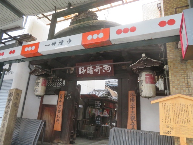 こちらのお寺は、祇園商店街にある小さなお寺で見逃しそうです。しかし、第16番札所です。浄土宗に属する寺院で、「目疾地蔵」の名で人々に親しまれています。入り口は、お寺の山門と祇園商店街の紅白の電光看板が重なって、複雑な構造になっています。