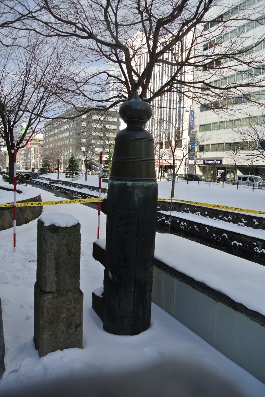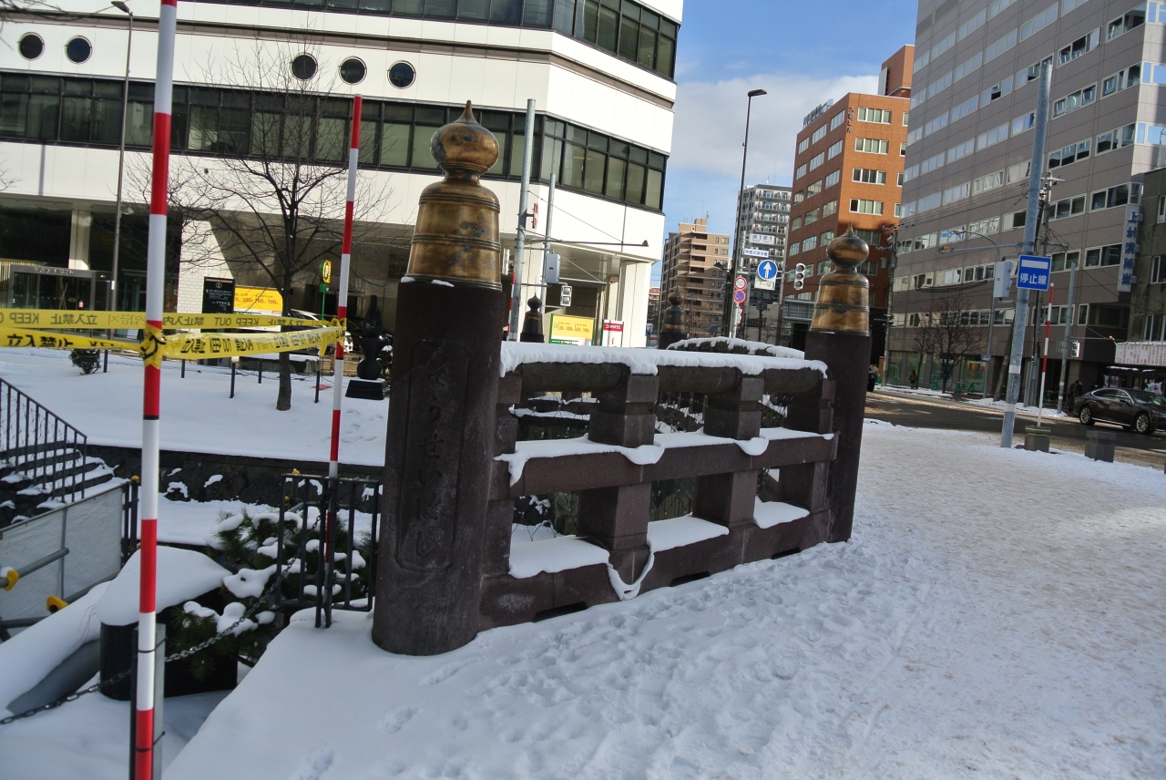 創生川にかかる橋ですが、擬宝珠のついた和風のデザインになっています。石造りのアーチ橋や親柱、欄干などは改修復元されたものですが、近くに設置されている大友亀太郎の銅像の横には、古い創生橋の親柱が残されていました。
