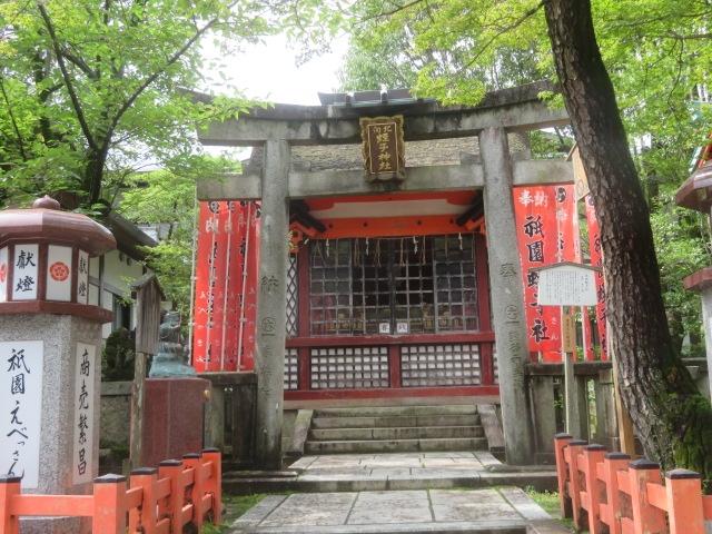 えべっさんと称されており、福の神、商売繁昌の神様として崇拝されています。入り口の石碑に「祇園えべっさん」と書かれていました。石碑も華やかで、朱塗りの欄干もえべっさんらしい華やかさを演出しています。記録に「西楼門内、北向きに建つ」とあるのが名前の由来のようです。