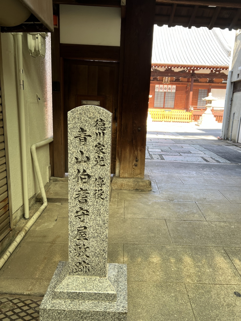 大手筋商店街に三門がある寺院です。商店街から山門を入るとすぐに本堂があります。特にこれといった見どころがあるわけではありませんが、山門前に徳川家光傅役青山伯耆守屋敷跡という石碑がありました。家光の教育係であった青山忠俊のことと思われます。