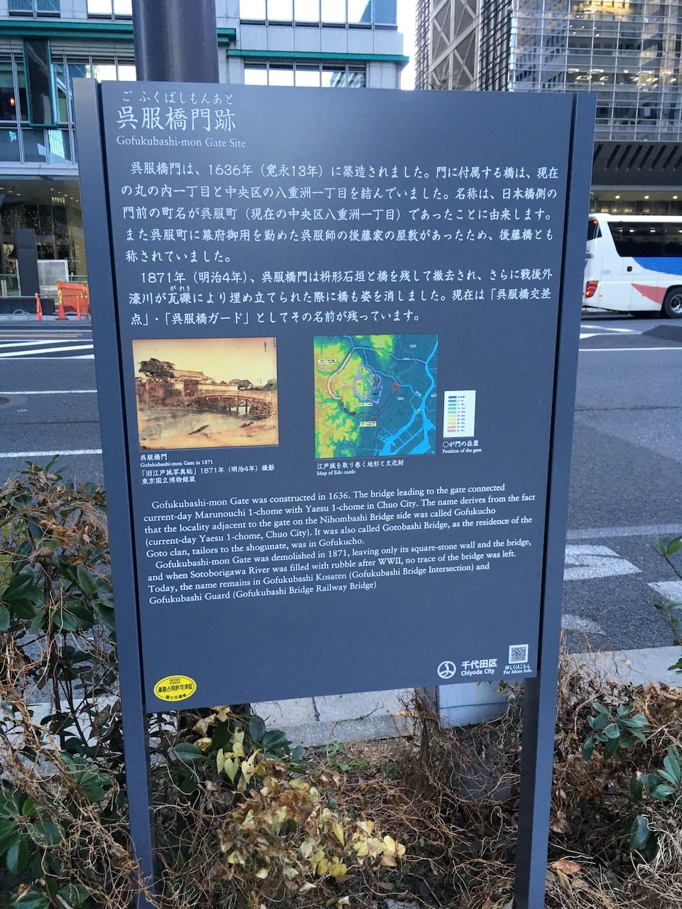 説明によると、実際に橋や門があったのは100mほど東の呉服橋交差点付近になります。