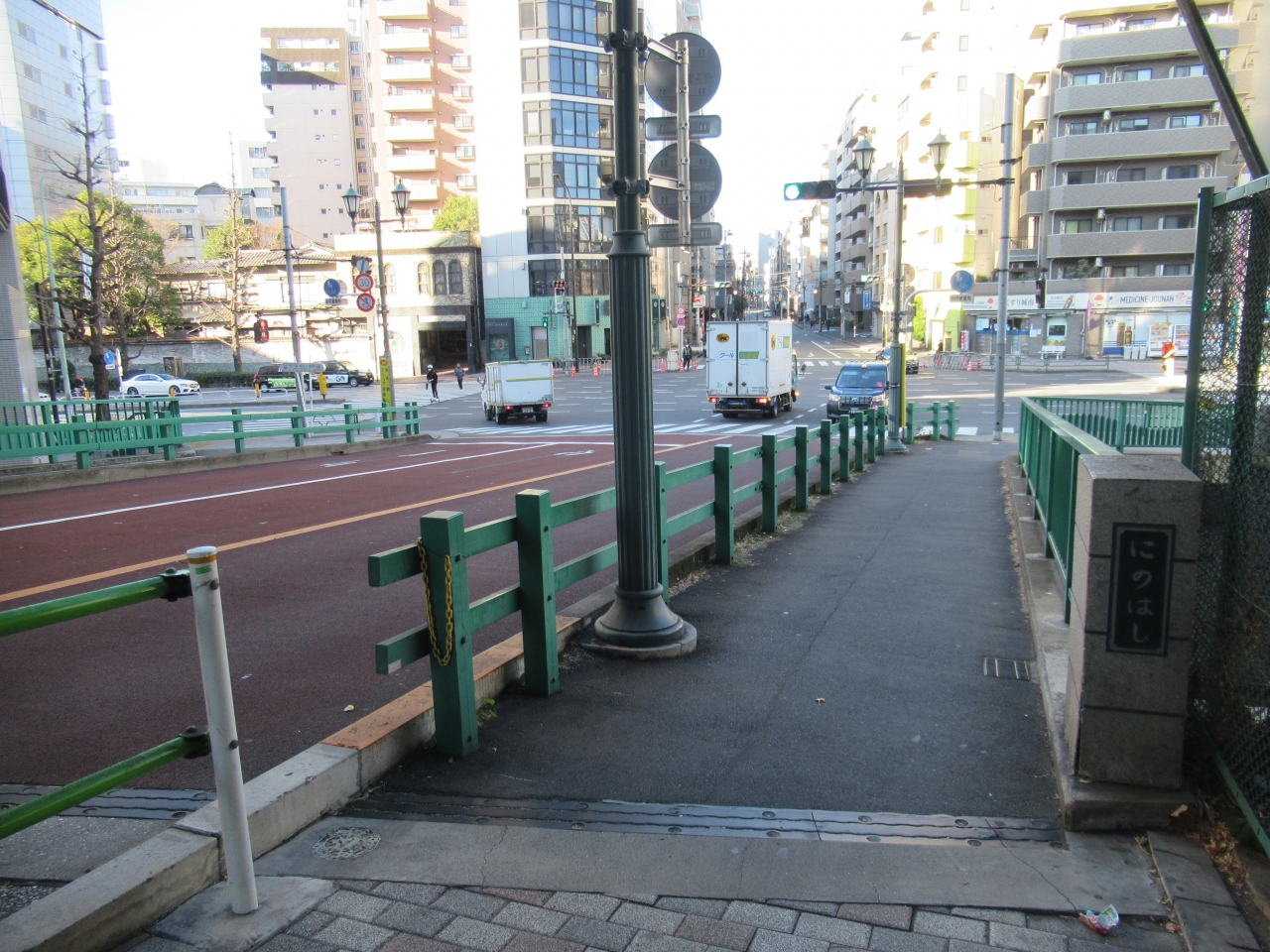 麻布十番駅2番出口から150mほど歩いた古川に架かる橋です。麻布通りから日向坂下に入るところにあります。欄干は緑色で、木製の柵をイメージしたように造られている緑色のガードレールが特徴です。この辺りに毛利日向守邸があったことから江戸時代を彷彿させるガードレールにしたのかなと思いました。日向橋ともいわれたそうです。