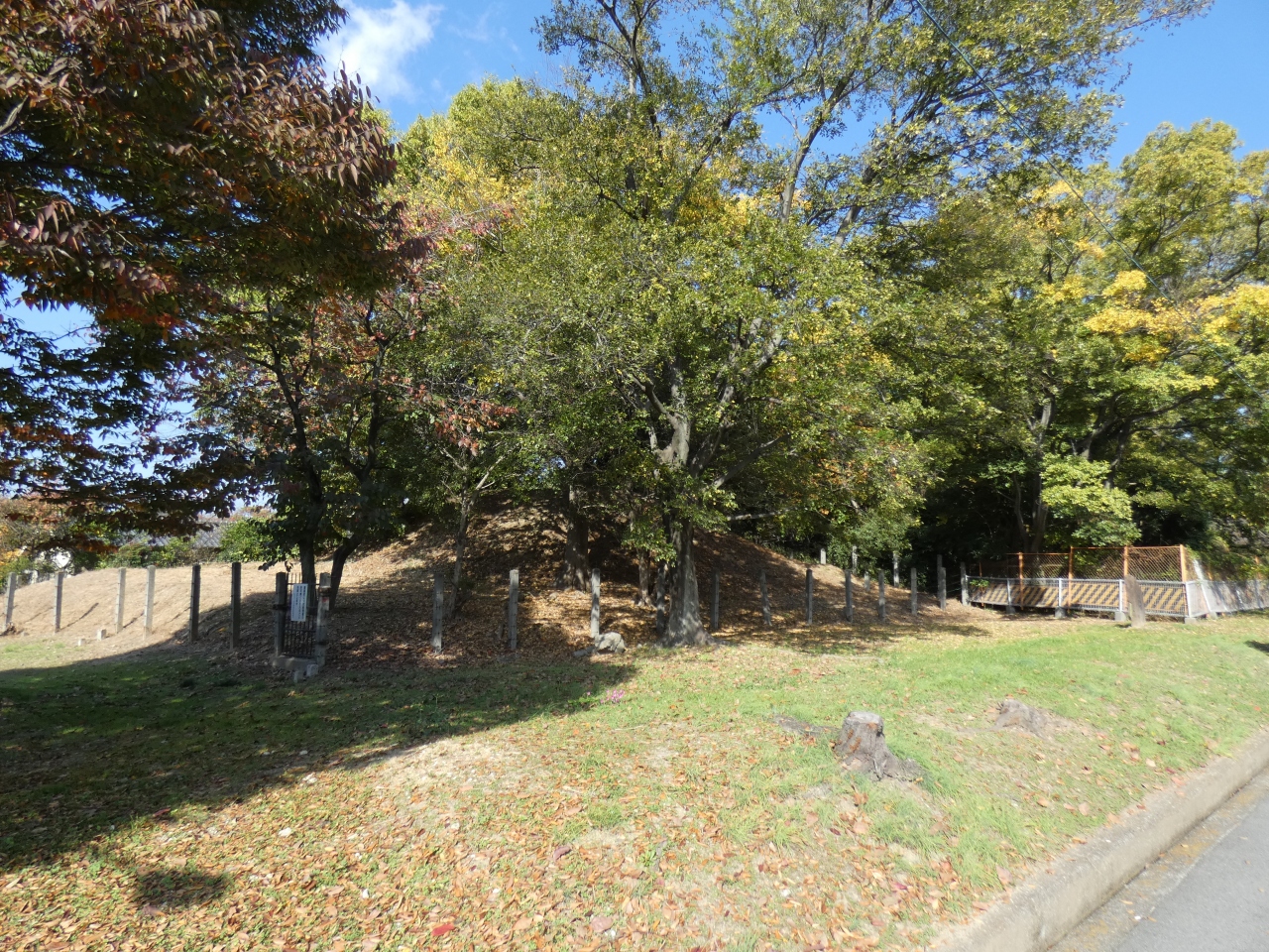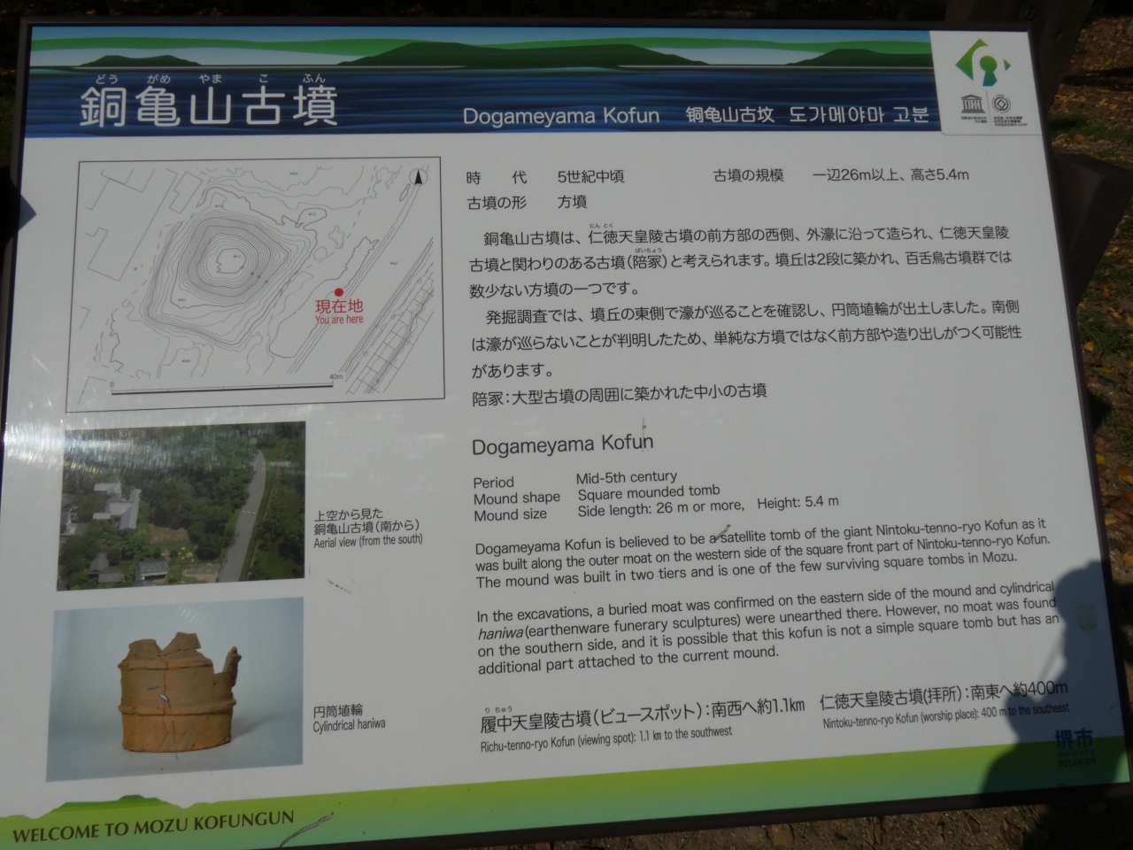 仁徳天皇大仙陵南西角の外濠に隣接する古墳で陪塚とされています。世界遺産の構成遺産の一部となっています。墳丘は高さ5.4mで二段構成の方墳、陪塚では数少ない方墳で、百舌鳥古墳群最大級です。一辺が26mの規模で、5世紀中頃の築造の様です。