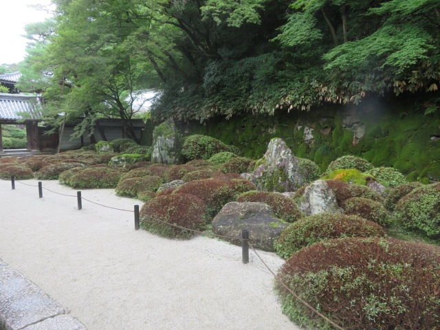 必見は、「二十五菩薩の庭」です。知恩院所有の国宝の「阿弥陀如来二十五菩薩来迎図」をもとに造られたもので、臨終の時に、念仏を称えれば、阿弥陀如来と二十五菩薩が浄土へ迎えてくれる様子をイメージしたもので、その事を心得て見るとそんな風に見えるお庭です。
