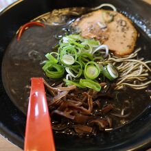 頂いたのは博多とんこつラーメンの白と黒と餃子。私は黒を頂きましたが、マー油がたっぷりと入りキクラゲとの相性がとても美味しいラーメンでした。間違えて入った店ですが、意外と美味しと思いました。