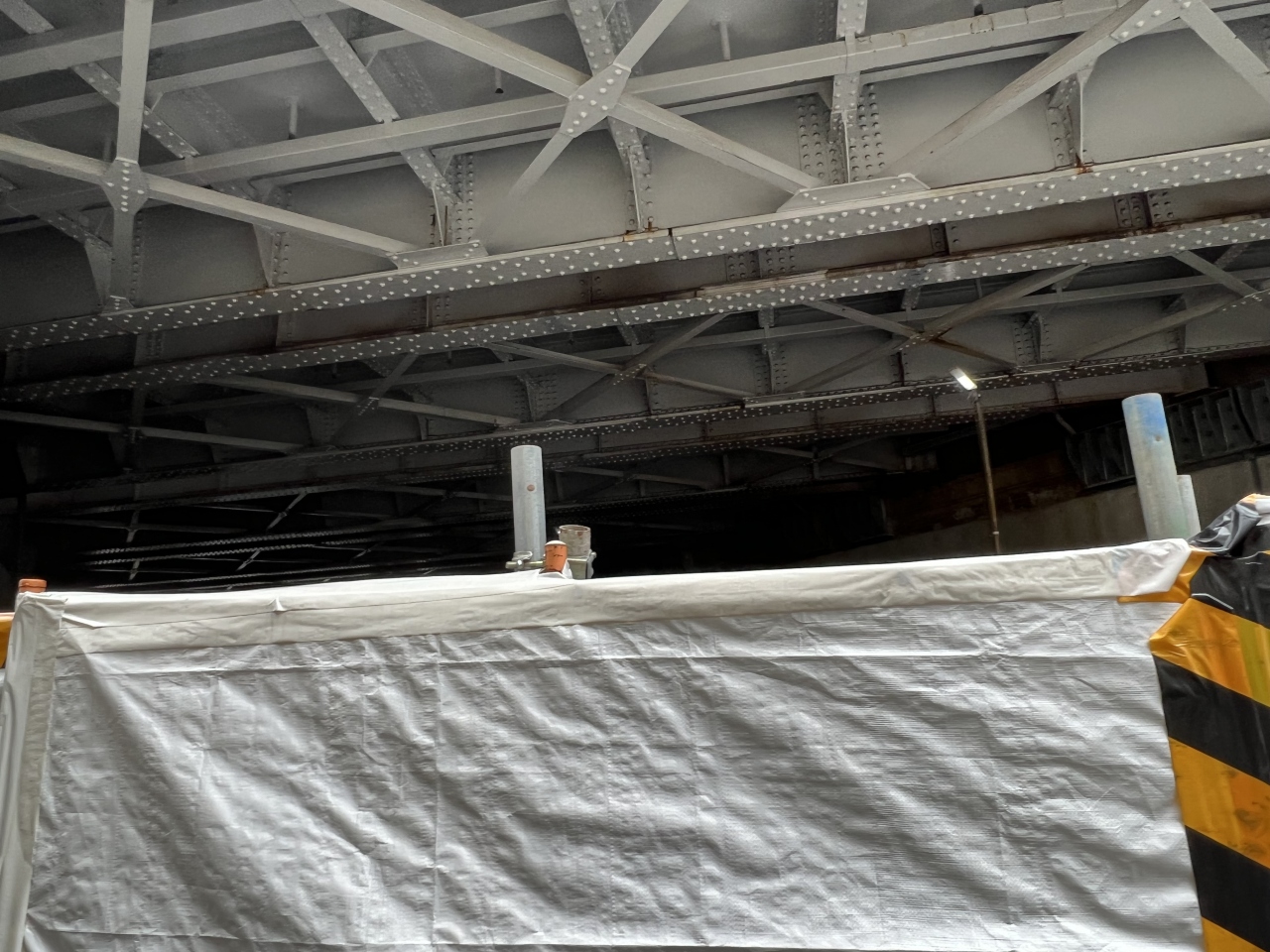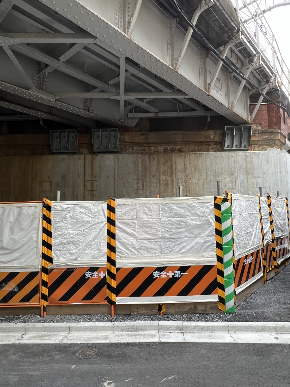 訪問時は工事中でした。歩道がフェンスで囲われて、ガードの工事なのか、それとも歩道の工事なのかよくわかりませんでした。どちらにしても道路が狭くなっていました。昼間でしたが、人通りをあまりなかったですが、下から見上げるリベットの鉄橋はなかなか見ごたえがありました。