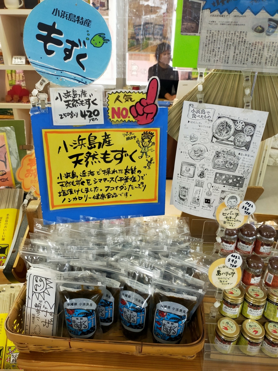 小浜島の離島のりばの待合室にある小さな売店ですが、小浜島のお土産も売っていて、帰りにお土産を買うことができます。小浜島産のもずく、ビバーチコショウなどはおすすめのお土産です。帰りの立ち寄りをおすすめします。