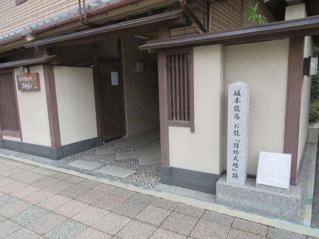 この地は、青蓮院の旧境内で、その塔頭金蔵寺跡です。なぜ、この地が祝言の地に選ばれたかというと、お龍の亡父の楢崎将作が、青蓮院宮に仕えた医師であったためです。石碑だけ立っている寂しい場所ですが、近くの白川沿いに柳があり、いい雰囲気です。