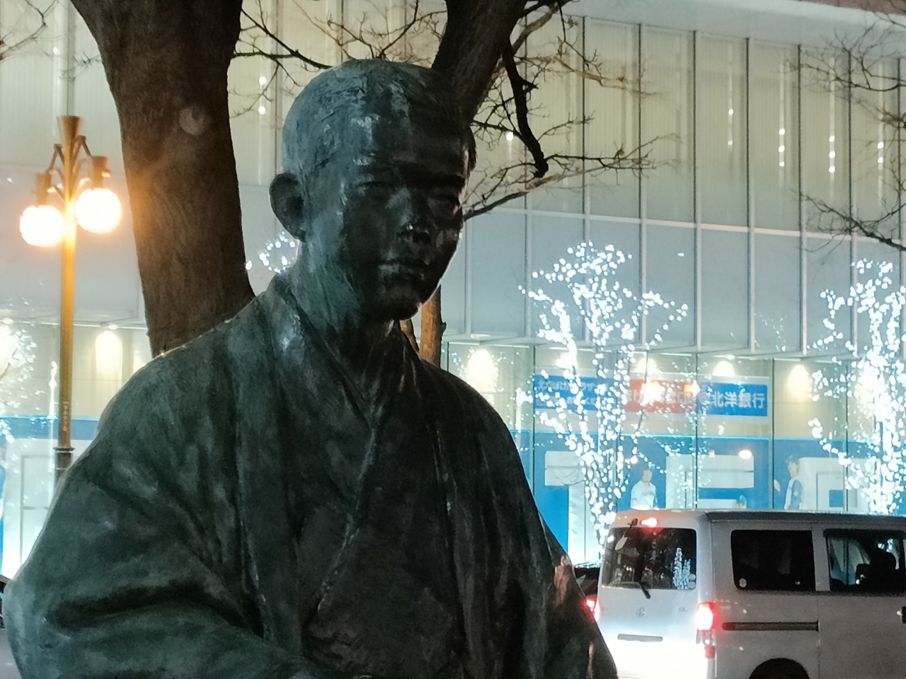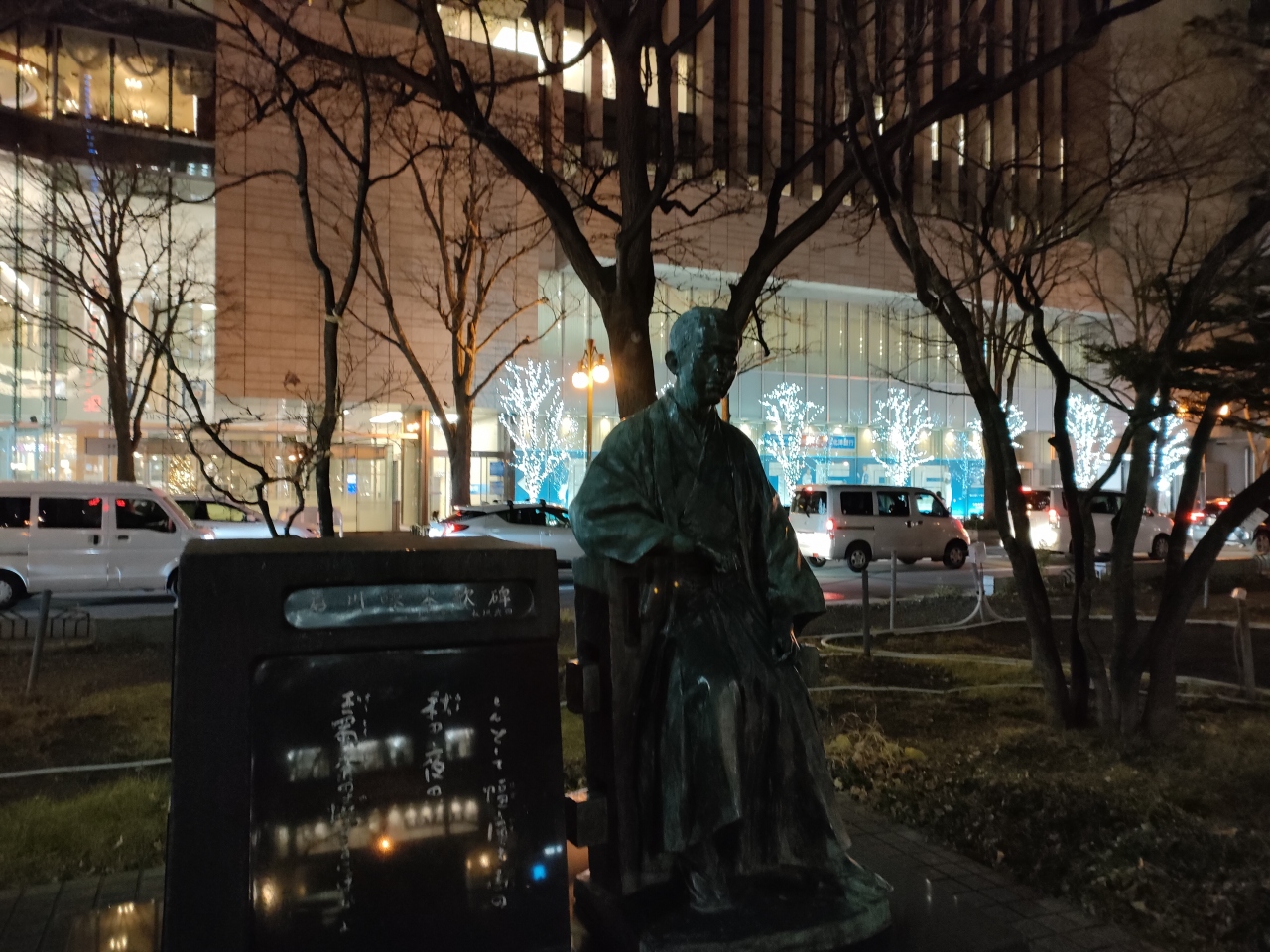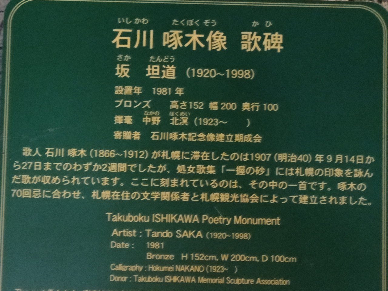 札幌ではほかに、札幌駅北口から徒歩2分(約100m)のビル入口に胸像、同じく北口から徒歩8分(約600m)の小園地に歌碑があります。