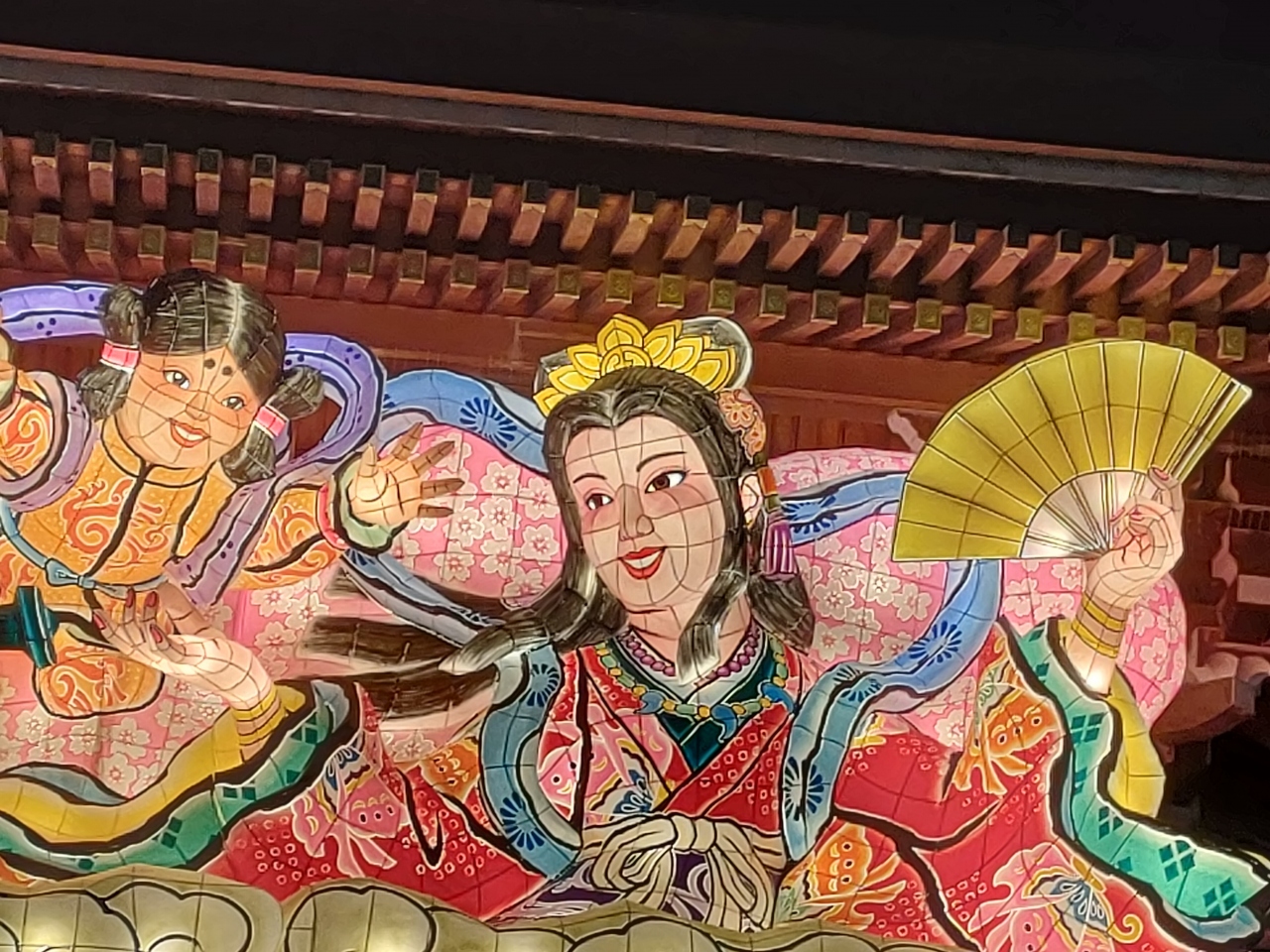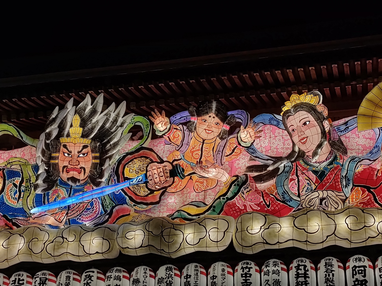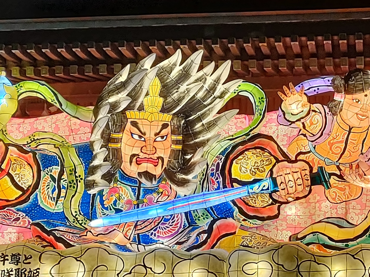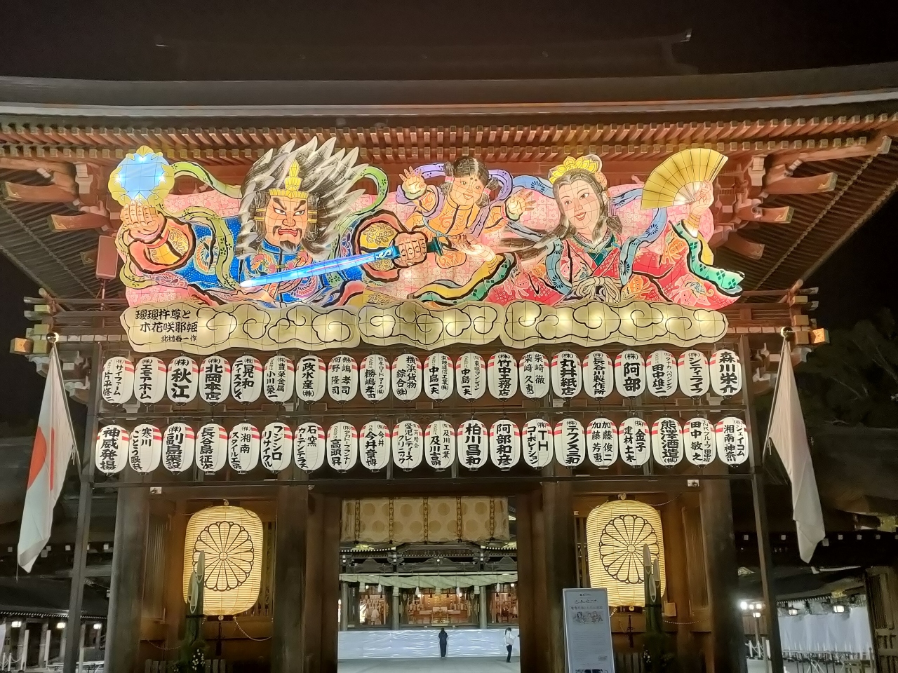像の意匠も毎年異なり、今年のテーマは「瓊瓊杵尊と木花咲耶姫」(ににぎのみこととこのはなさくやひめ)ということですが、今年は真ん中に火遠理命(ほおりのみこと)という子供が加わって愛らしい感じになっていました。