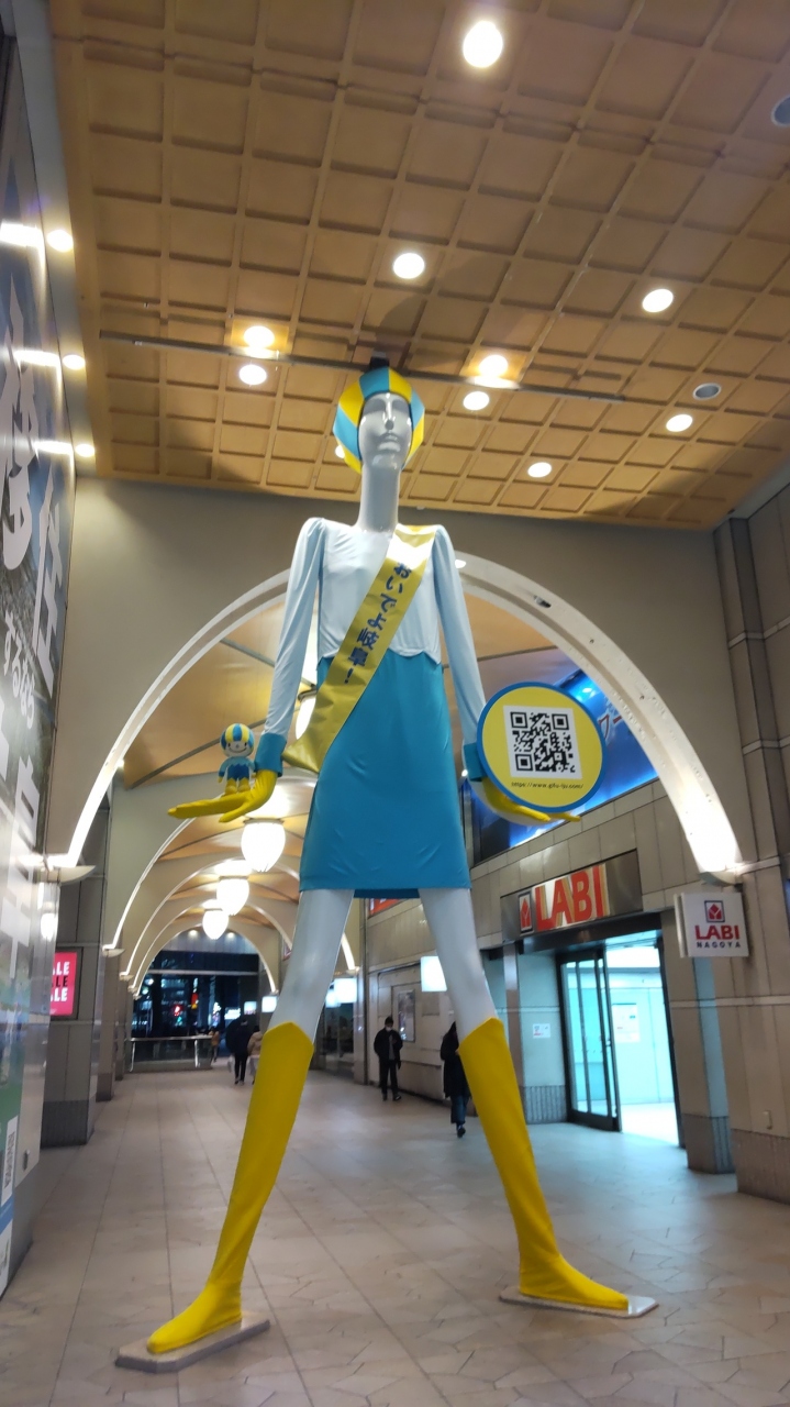 名古屋駅近くの巨大な人形です。名鉄デパート前の通路に脚を広げて立っている姿は威厳があります。ワンピース姿のナナちゃんの下を通り抜けることも可能です。一見不気味な感じもする巨大なナナちゃんの人形、頻繁にお色直しするようで着替シーンも観たいです。