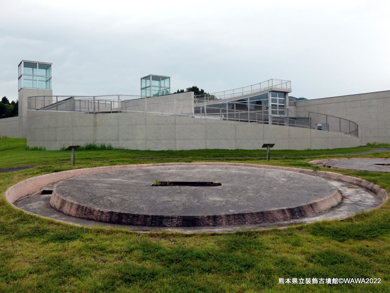 熊本博物館(熊本城内)の見学を終え、レンタカーで一般道を30㎞ほど北に走り、熊本県立装飾古墳館に到着しました。施設に隣接した無料駐車場に車を停め、安藤忠雄氏の手になる建築を眺め、広い庭の様な場所に展示されている再現遺跡を見学しました。
