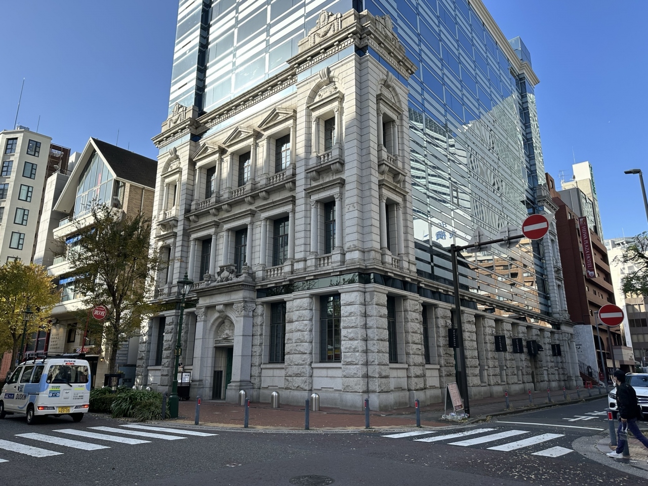 JR関内駅北口から歩いて7分のところ、馬車道を挟んでデイリーヤマザキの向かい側に、入口に「損保ジャパン横浜馬車道ビル」というプレートが掛かったビルがあります。9階建てで壁面ガラス張りのモダンなビルですが、通り(馬車道と弁天通り)に面した2面は、3階までファサード保存されていて、当時のままの姿が残されています。