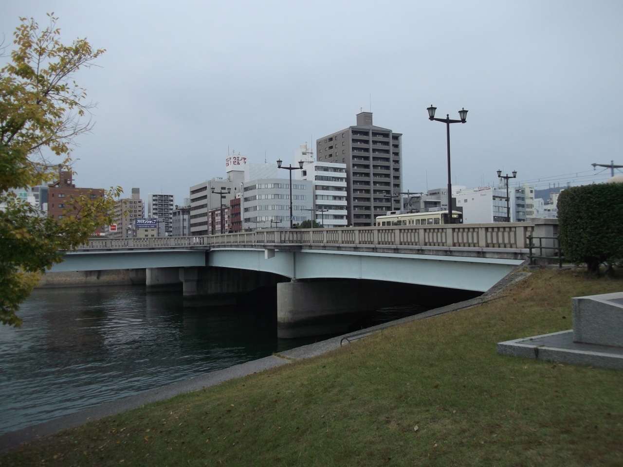 原爆ドームからほど近い、旧太田川と元安川が分かれる付近に架かる橋です。T字形をしていて、途中で分かれて平和祈念公園ともつながっています。橋は横幅も広いので歩道も歩きやすく、中央には広電の路面電車も走っています。橋の中程からは原爆ドームがよく見え、撮影スポットにもなっています。