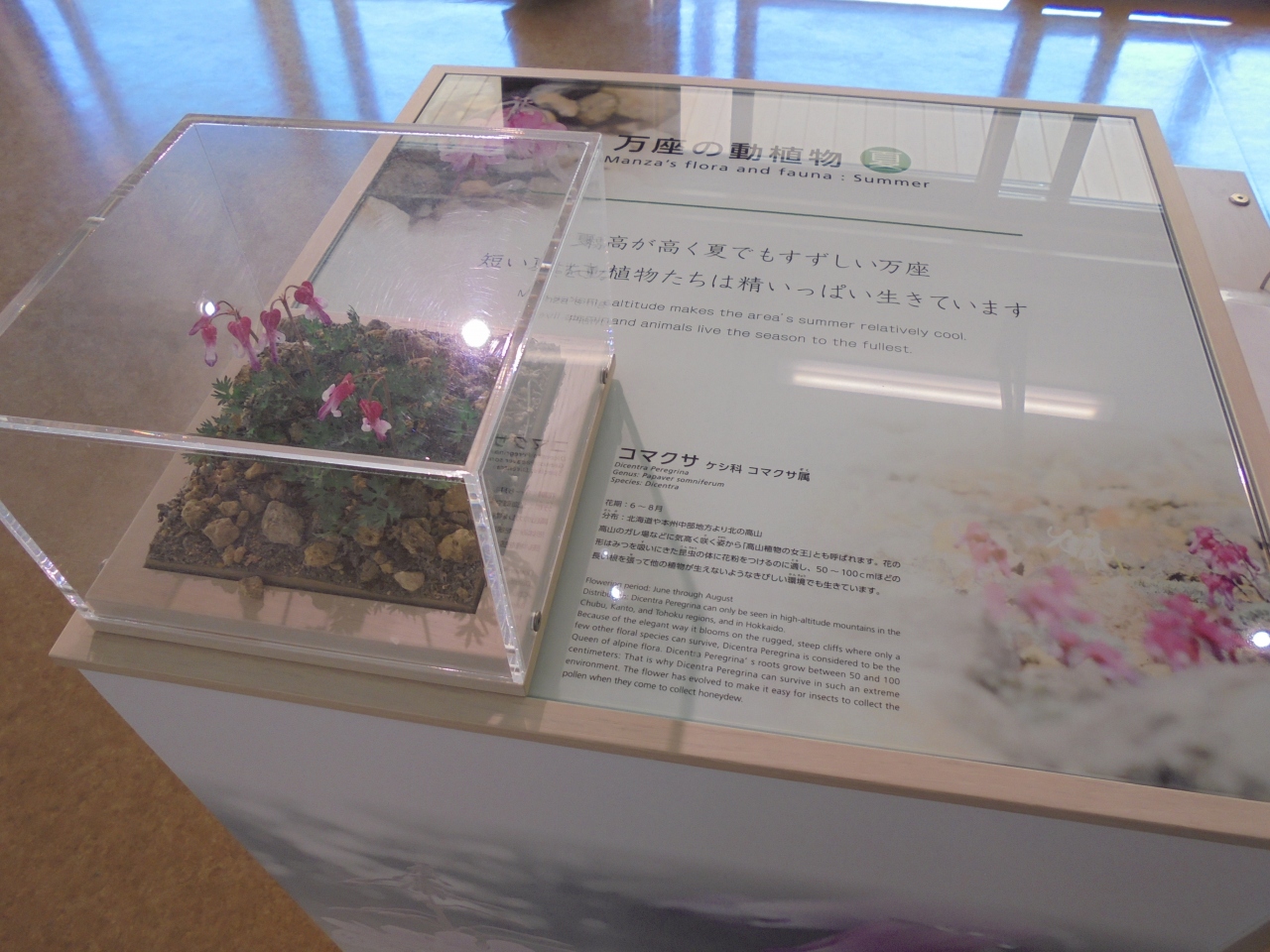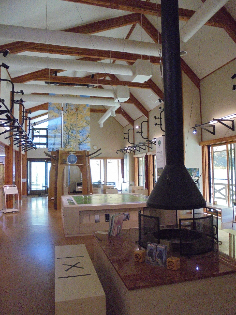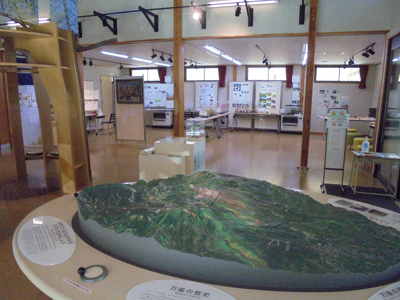 横手山を通過し、一部有料道路を通って万座温泉のこの施設へ。周囲には白い噴煙があがる斜面や硫黄の臭いがする場所もあります。情報館の入館料は無料。このあたりの動植物や火山を含む地理が詳しく説明されています。展示には工夫がされていて、とてもわかりやすくなっています。子どもたちの遠足や校外学習に最適な施設です。