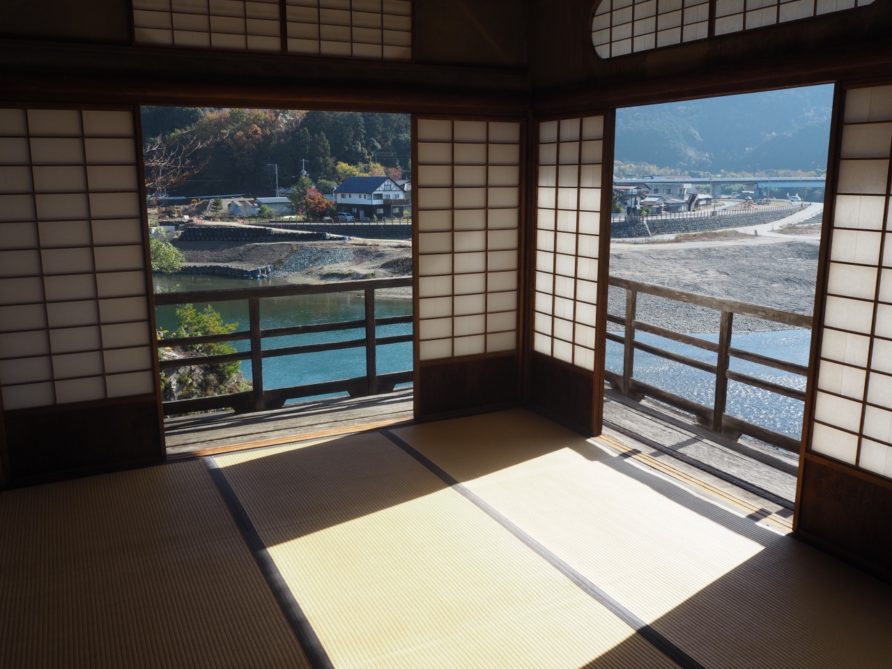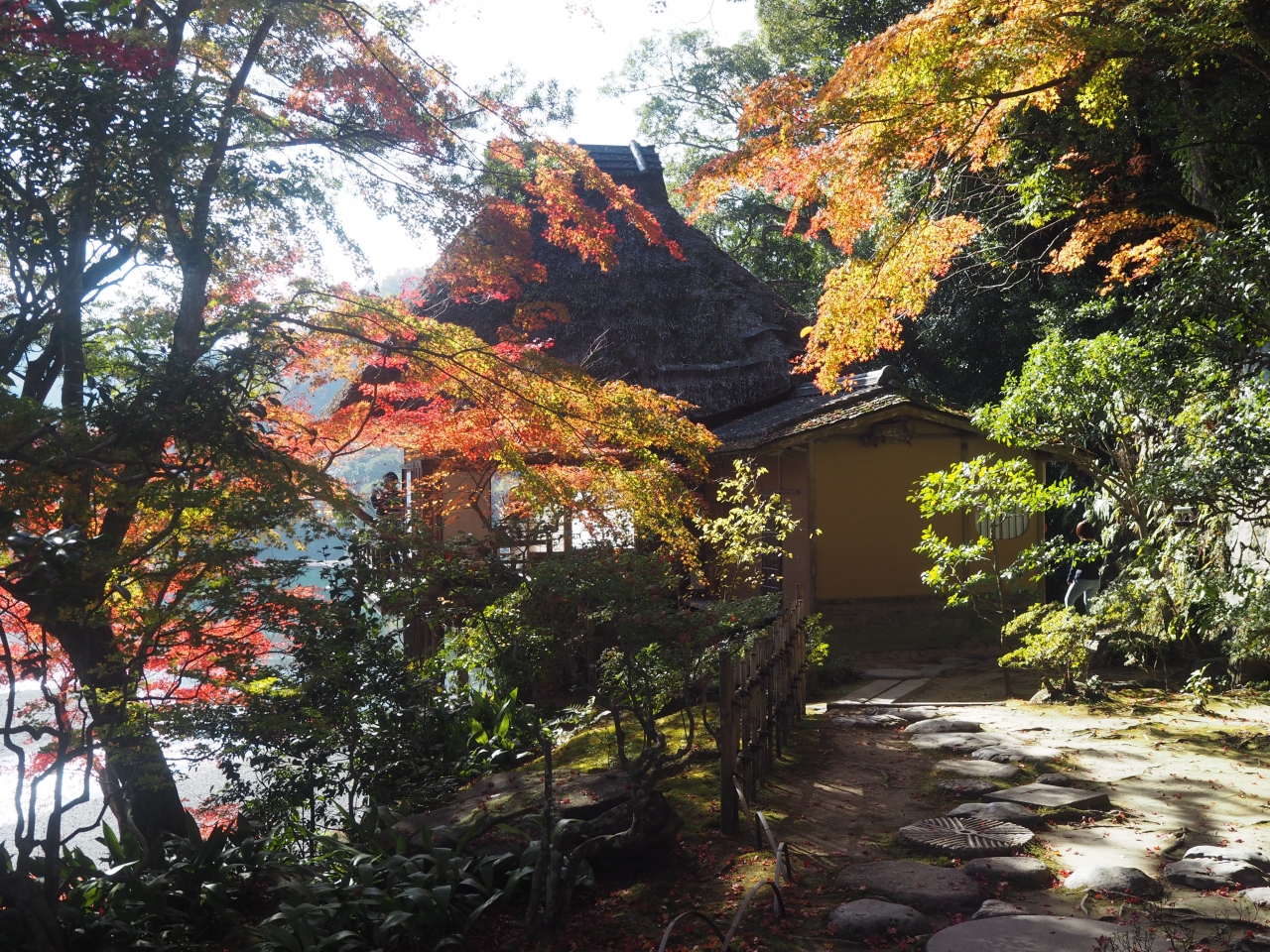臥龍山荘は大洲市の旧市街の東側の肱川沿いにある邸宅です。貿易商であった河内寅次郎が築いた邸宅で、様々な意匠が加えられて、建物、庭いずれも素晴らしいものです。建物内も自由に見学ができます。邸宅は肱川の川面から少し上の山斜面にあり、借景の景色も楽しめます。庭はきれいに手入れされており、庭は歩きながら楽しめる美しい庭園です。ちょうど紅葉も見られて満足な見学でした。